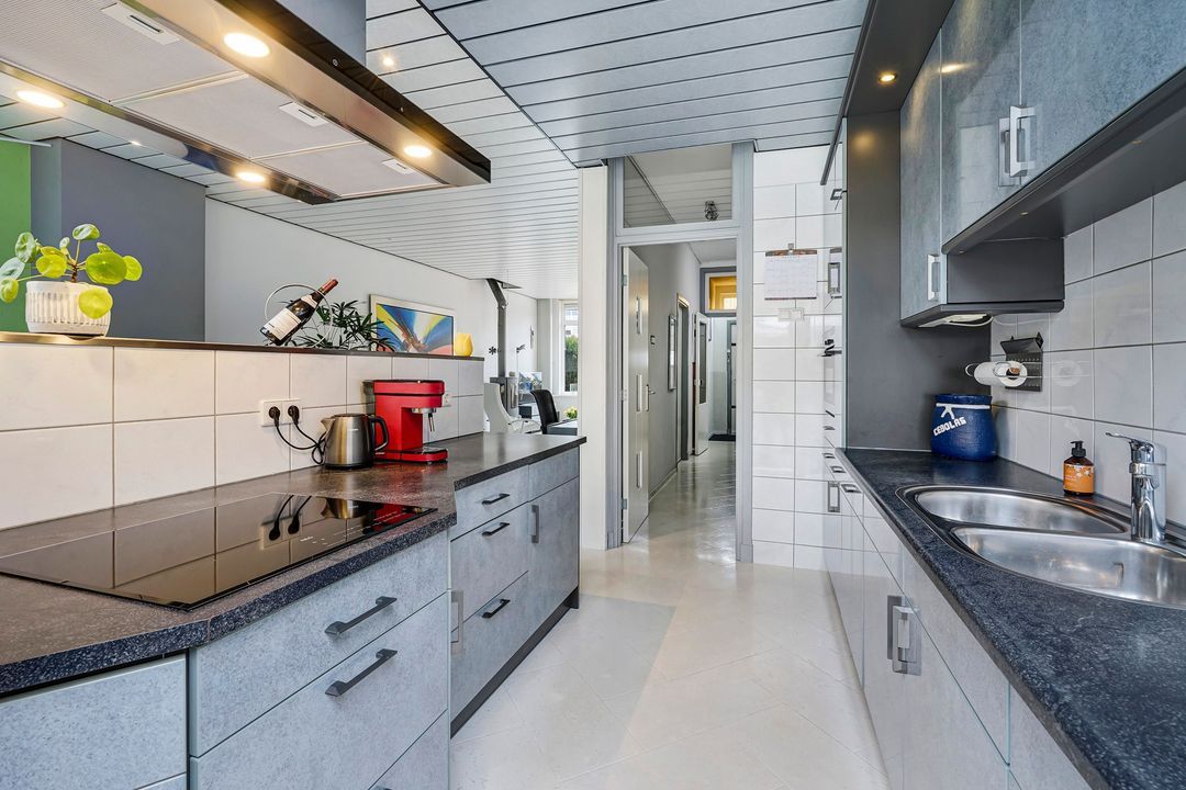 Sfeervolle lichte woon-/eetkamer voorzien van houtkachel, gashaard, infrarood paneel en een kurkvloer, tevens een verhoogde vloer aan de achterzijde van de woon-/eetkamer, alsmede de open keuken welke voorzien is van diverse inbouwapparatuur zoals, combi oven/magnetron, inductie kookplaat, afzuigkap, vaatwasser, koelkast en via deur en dubbele deuren naar de fraaie beschutte achtertuin (noordoosten) met houten schuur.