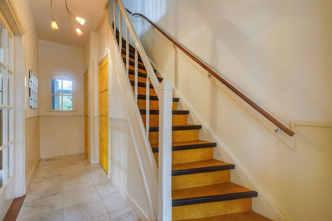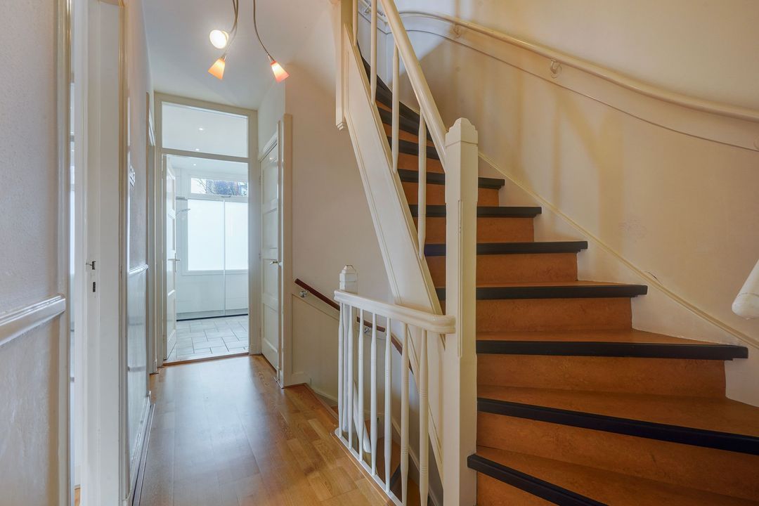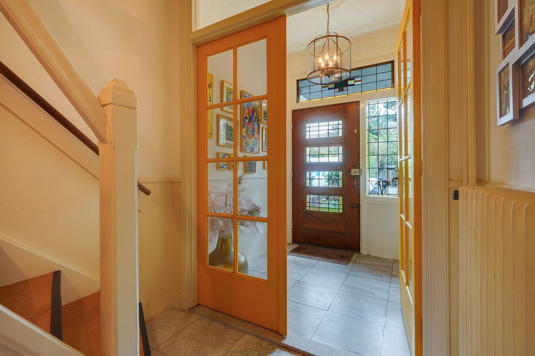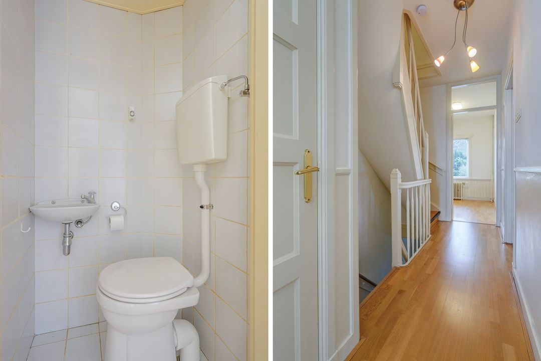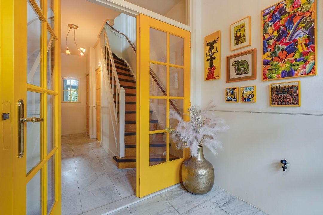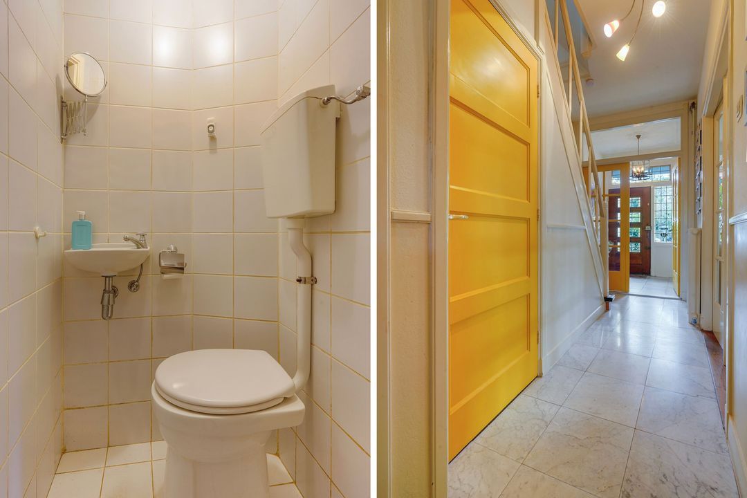 Via ruime voortuin, entree van de woning met luifel, klassieke voordeur met glas in lood lichten, vestibule met openslaande deuren en marmeren vloertegels doorgelegd in de gang, separaat geheel betegeld toilet met fontein en toegang tot de riante kelder.