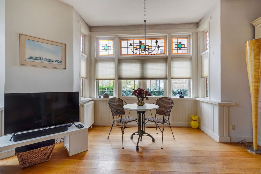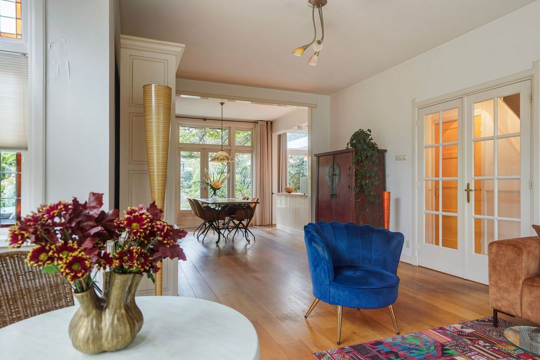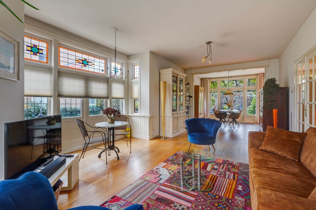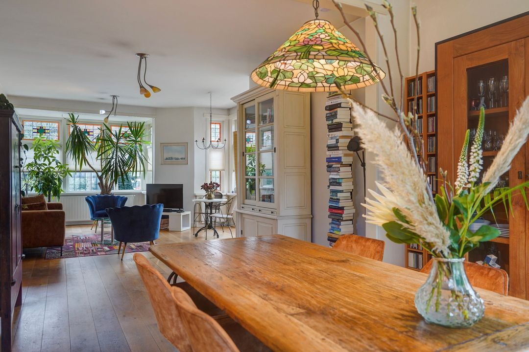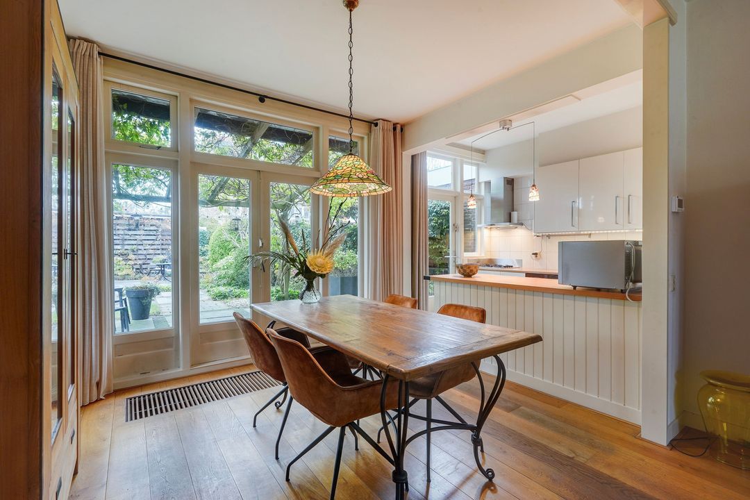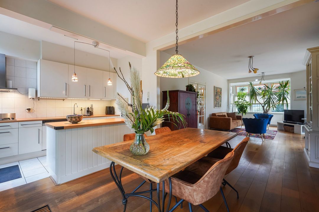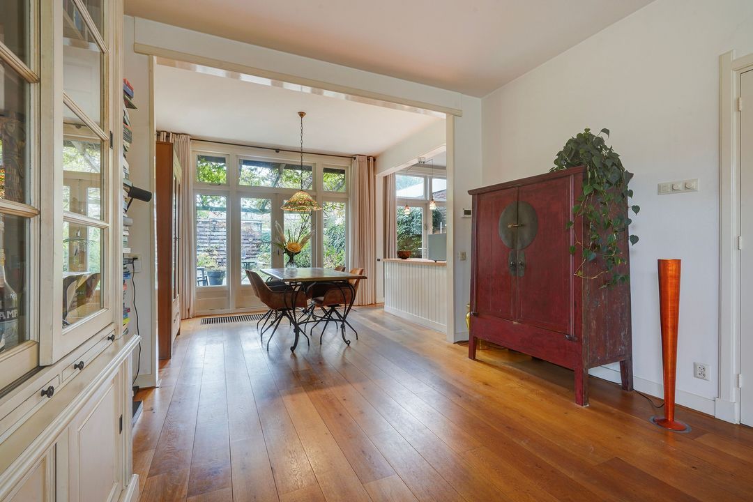 Via openslaande deuren toegang tot de riante woon-/eetkamer voorzien van een fraaie houten vloer met convector put, veel lichtinval door de voor- en zijerker met fraaie glas in lood bovenlichten en een goed onderhouden halfopen keuken voorzien van een 4-pits gasfornuis, afzuigkap, inbouwvaatwasser en 2 koelkasten met 1 vriesvak.