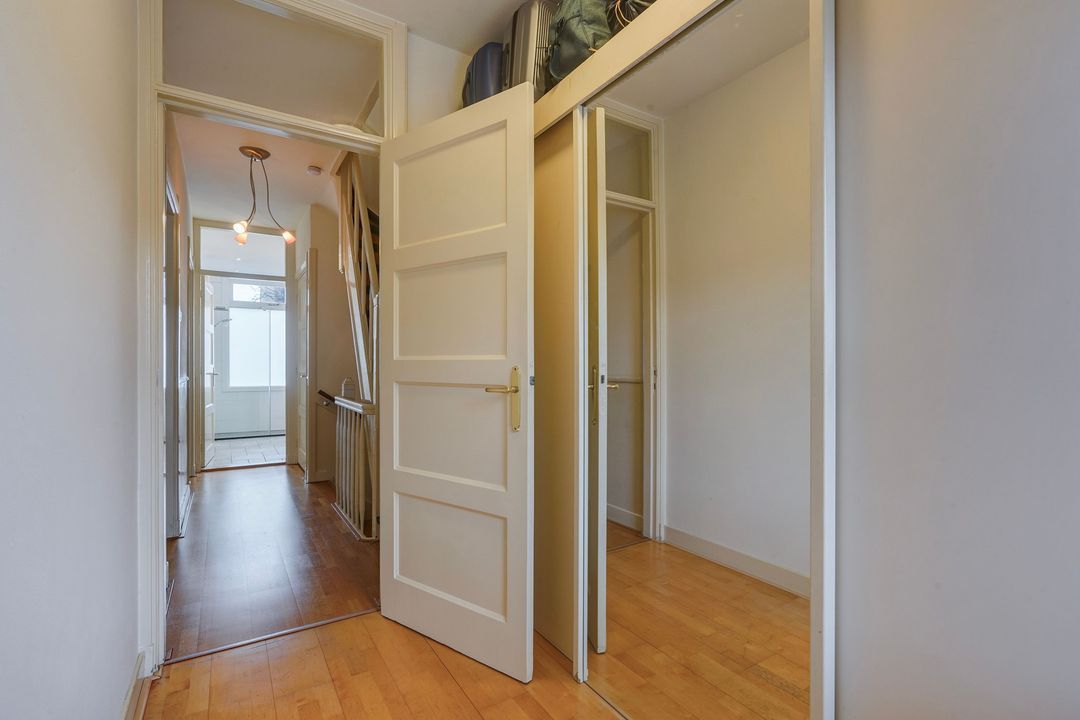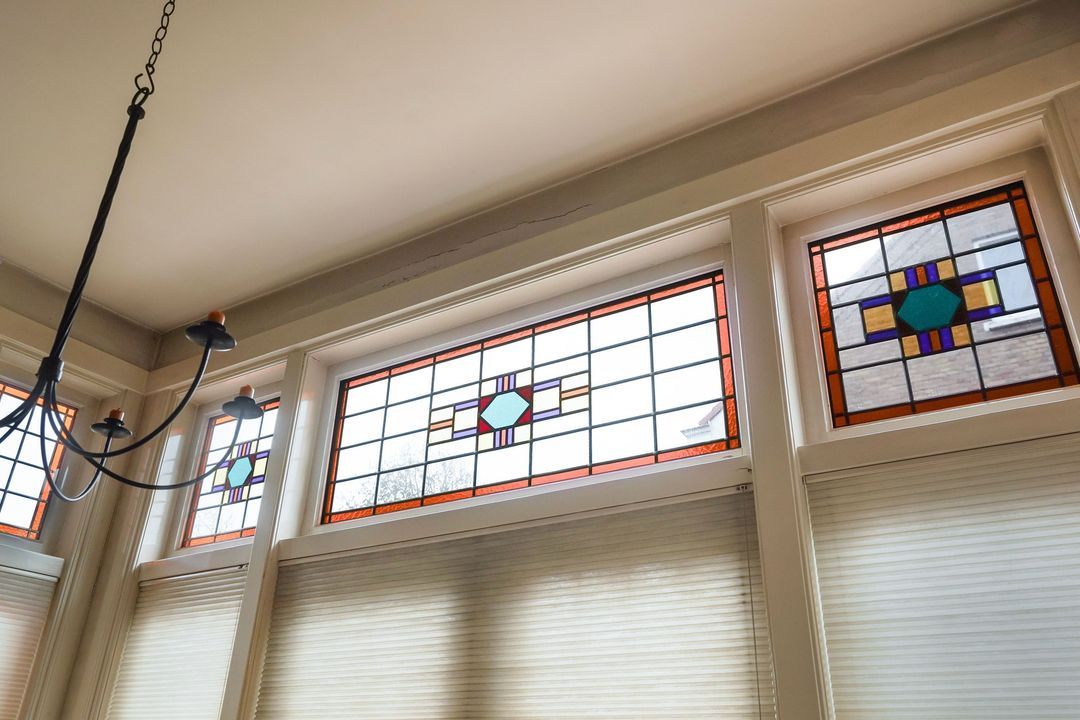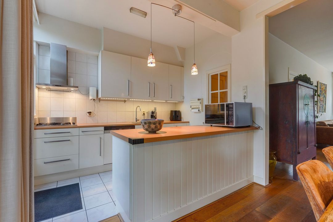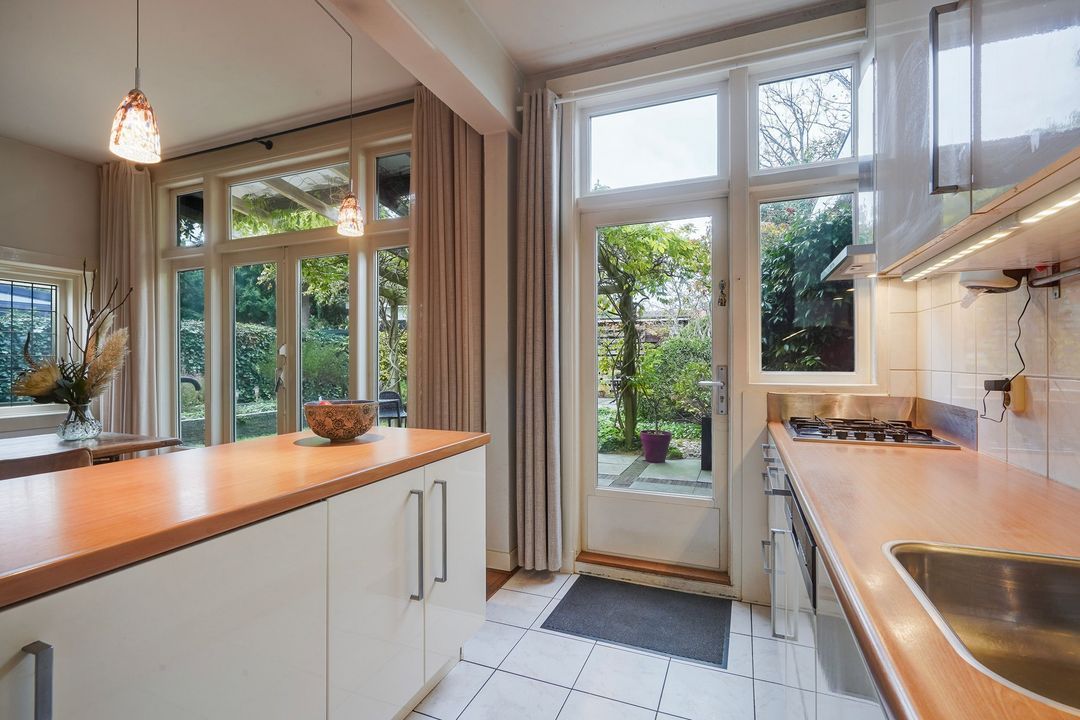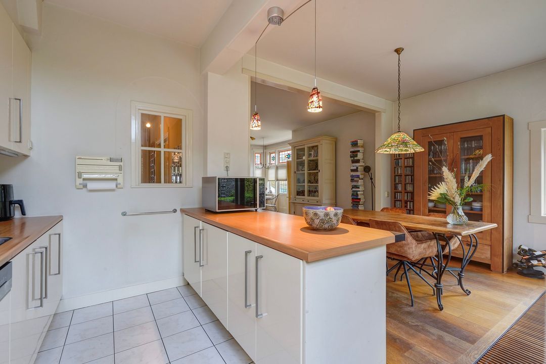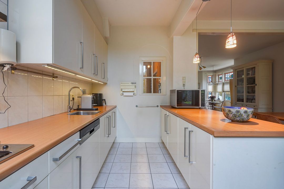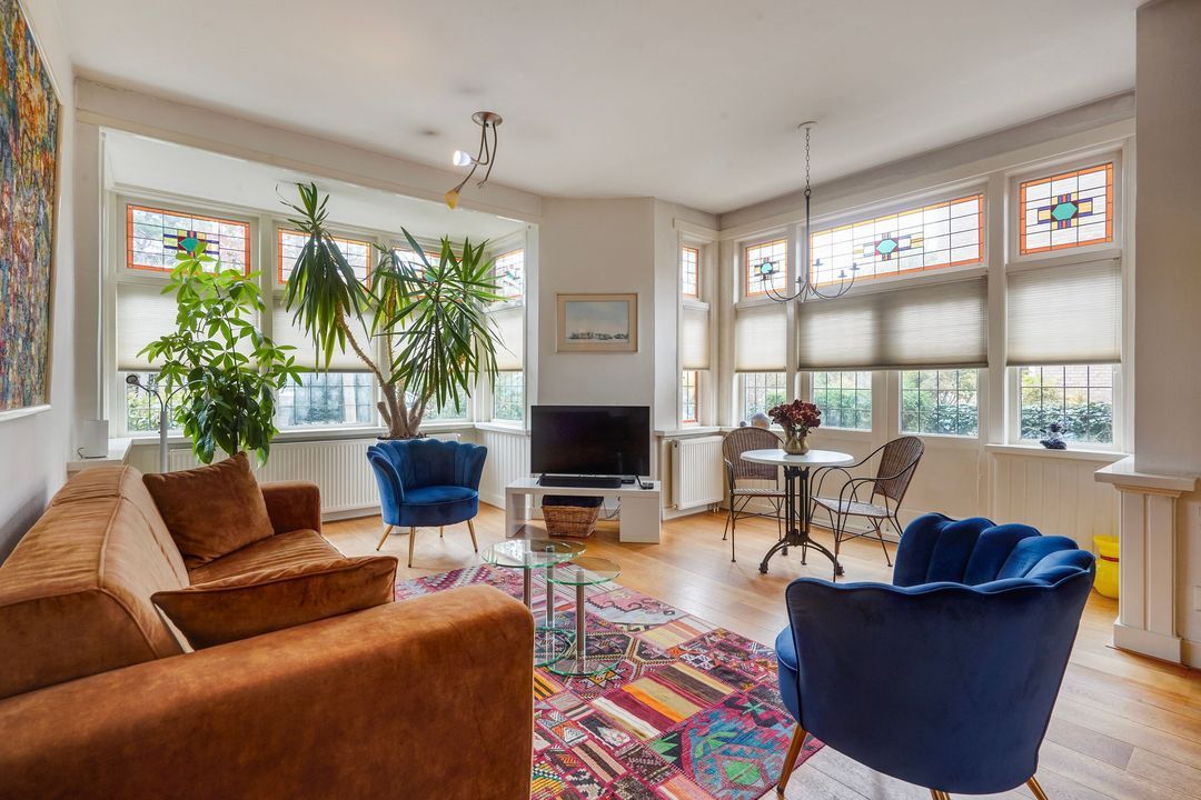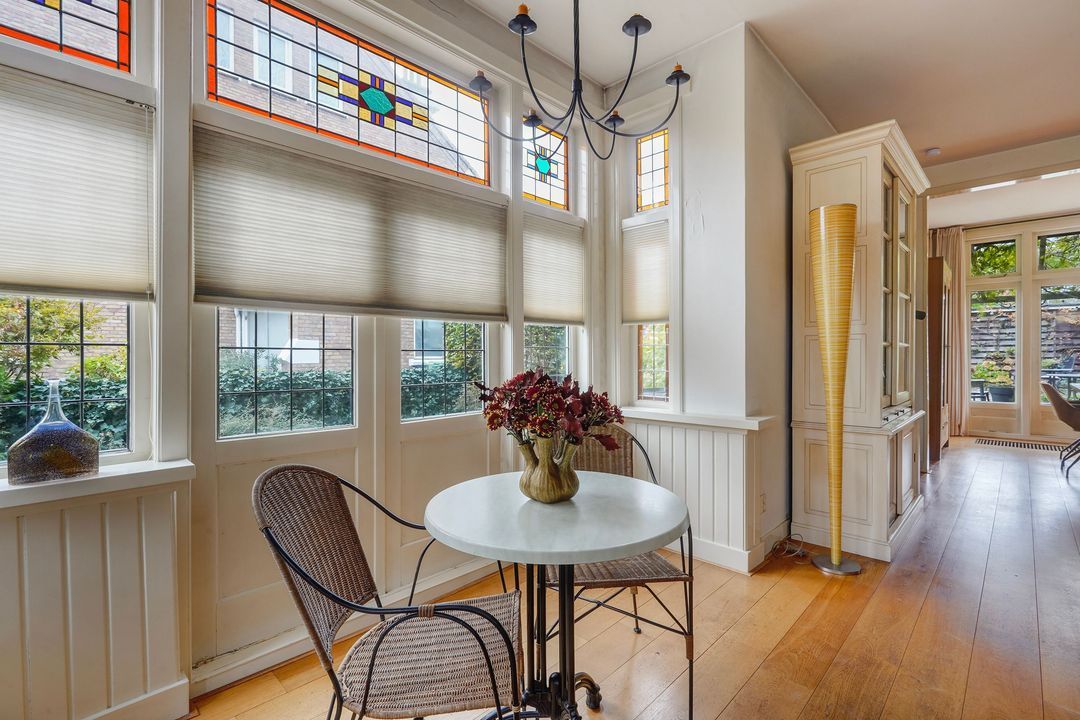 Via openslaande deuren toegang tot de riante woon-/eetkamer voorzien van een fraaie houten vloer met convector put, veel lichtinval door de voor- en zijerker met fraaie glas in lood bovenlichten en een goed onderhouden halfopen keuken voorzien van een 4-pits gasfornuis, afzuigkap, inbouwvaatwasser en 2 koelkasten met 1 vriesvak.