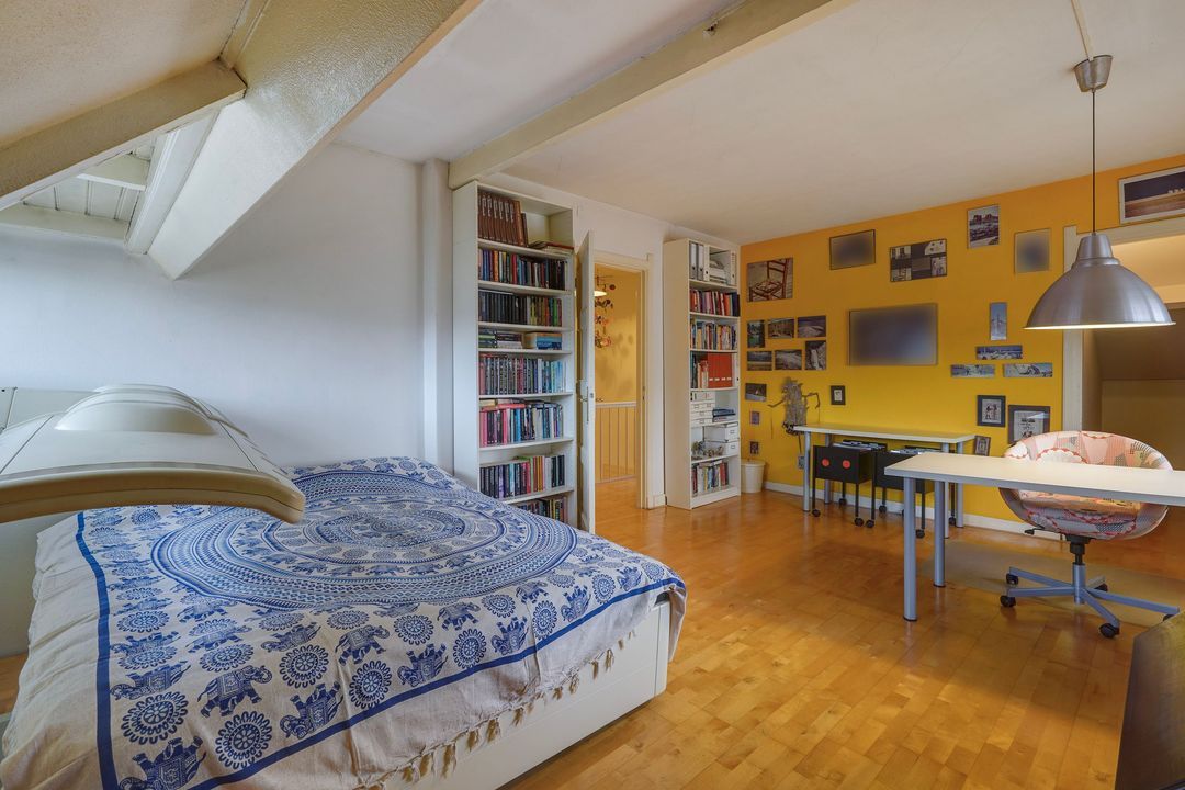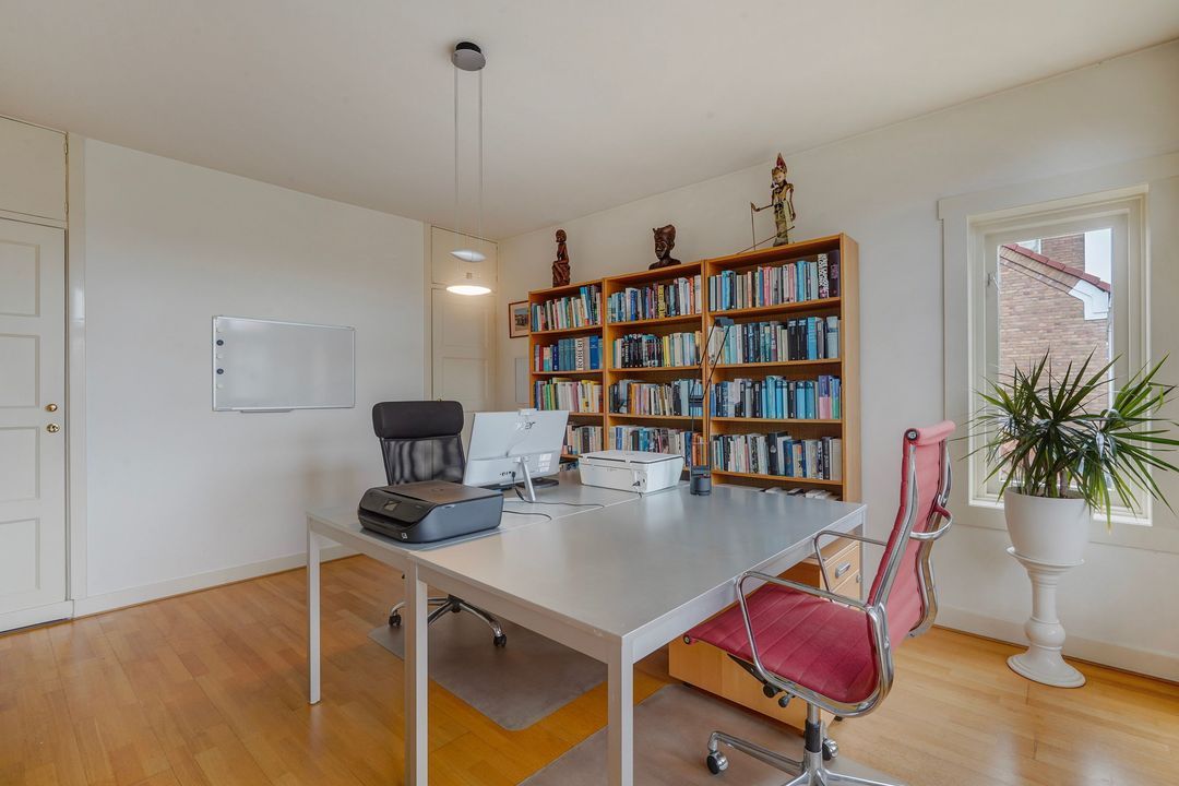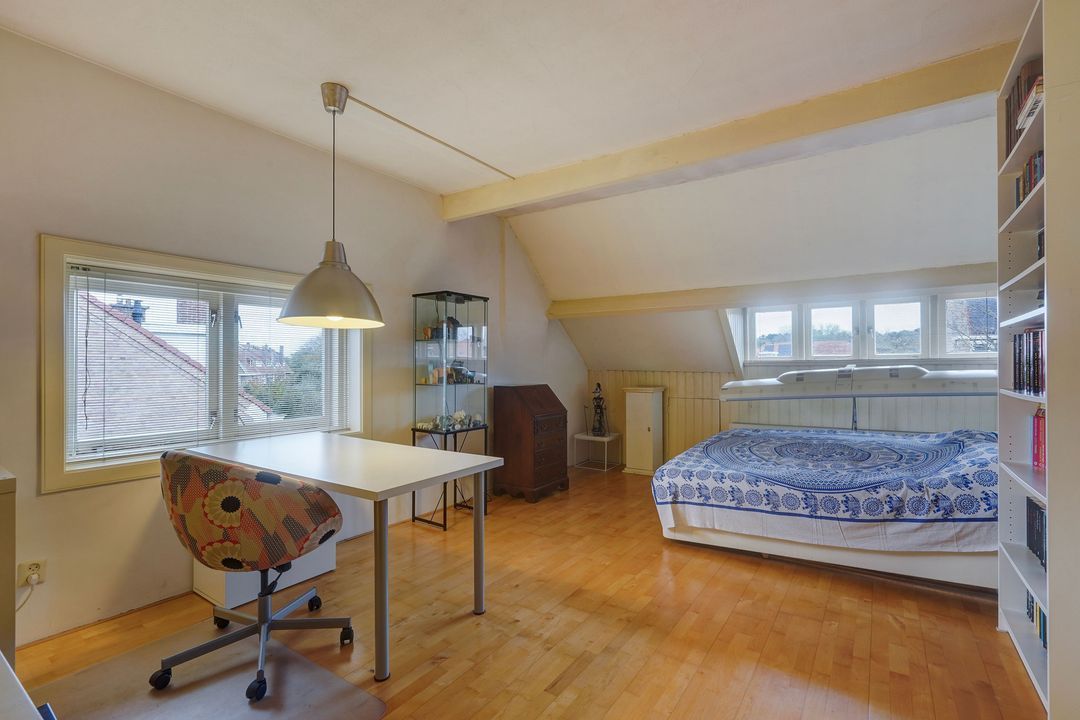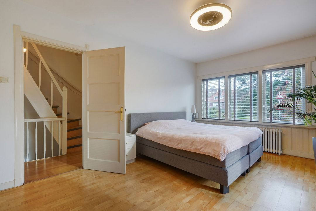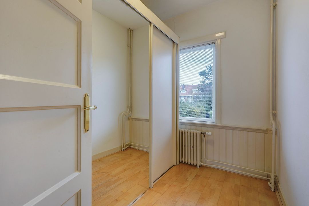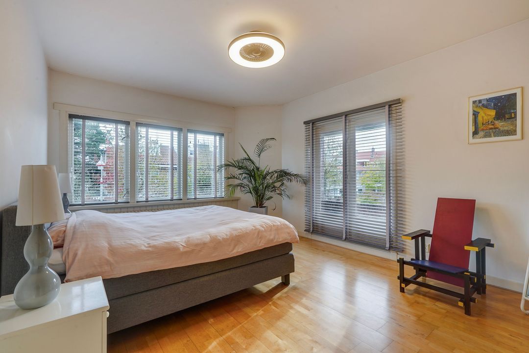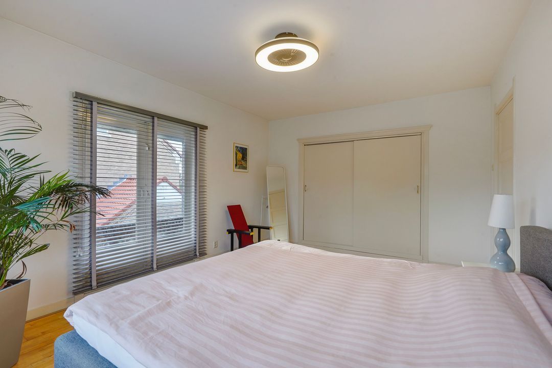Lichte voorslaapkamer met kastenwand en openslaande deuren naar het karakteristieke zijbalkon, gelegen op het zuidwesten, voorzijkamer.