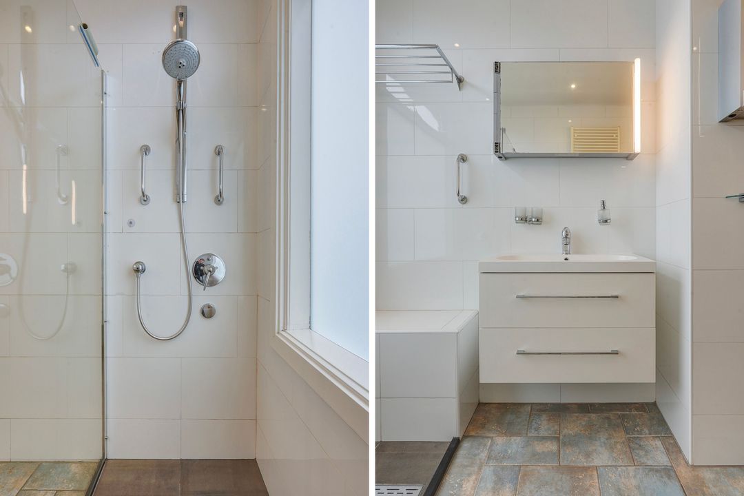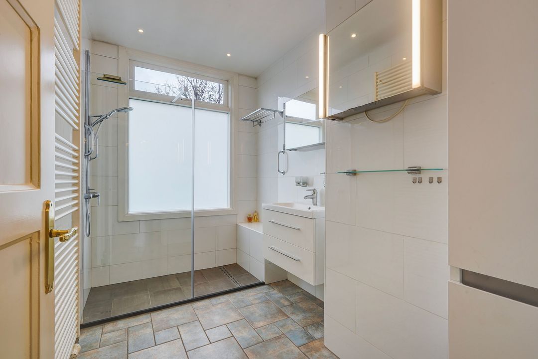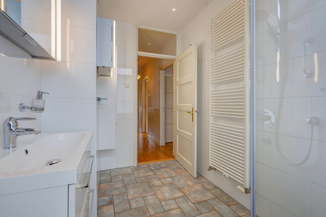 Overloop, 2e separaat toilet, aan de achterzijde gelegen geheel betegelde badkamer voorzien van ruime inloopdouche, wastafelmeubel en handdoekradiator.