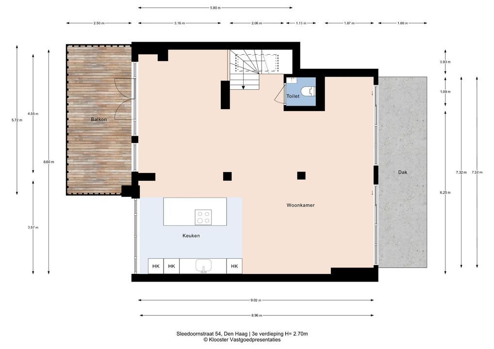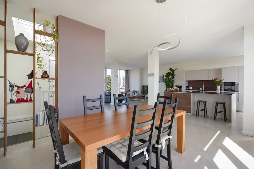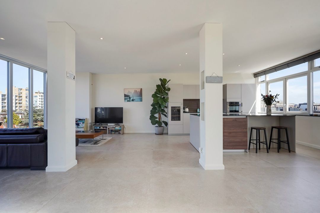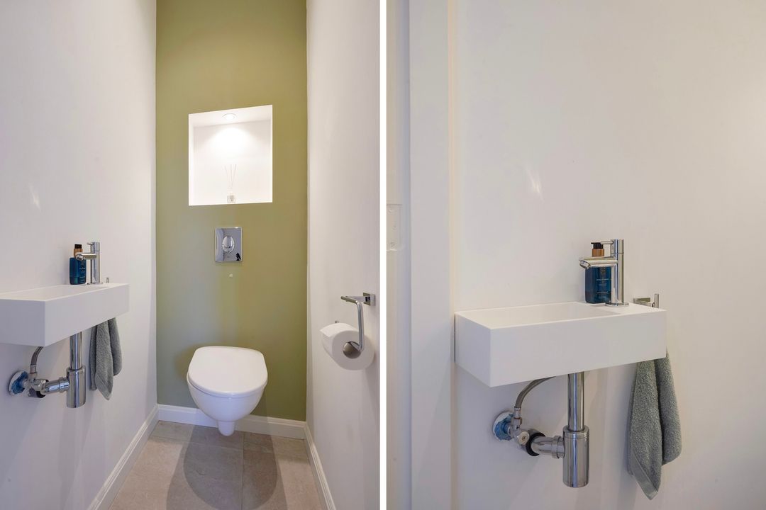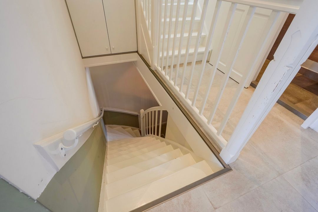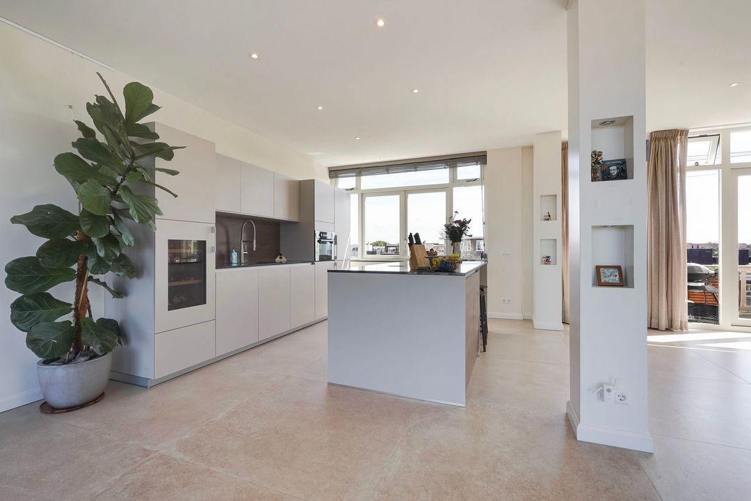Beautiful living room with a skylight above the stairs, large sand-colored floor tiles, a modern toilet with a hand basin and a luxurious open kitchen featuring a kitchen island and a kitchen unit equipped with an induction hob (Bora), dishwasher, wine cabinet, oven, fridge/freezer (3 drawers) and a composite countertop with a marble look. The front of this rooftop extension is almost entirely made of glass, providing a fantastic unobstructed view over the Sportlaan. At the rear, French doors open onto a sunny roof terrace with a view of The Hague skyline. The entire floor features underfloor heating.