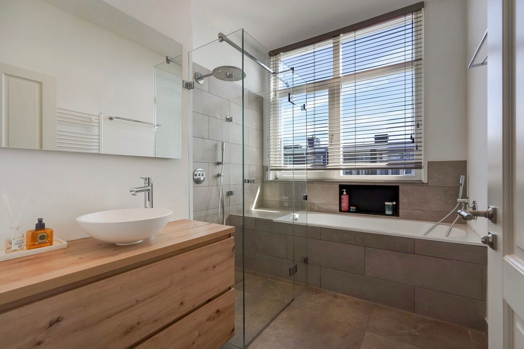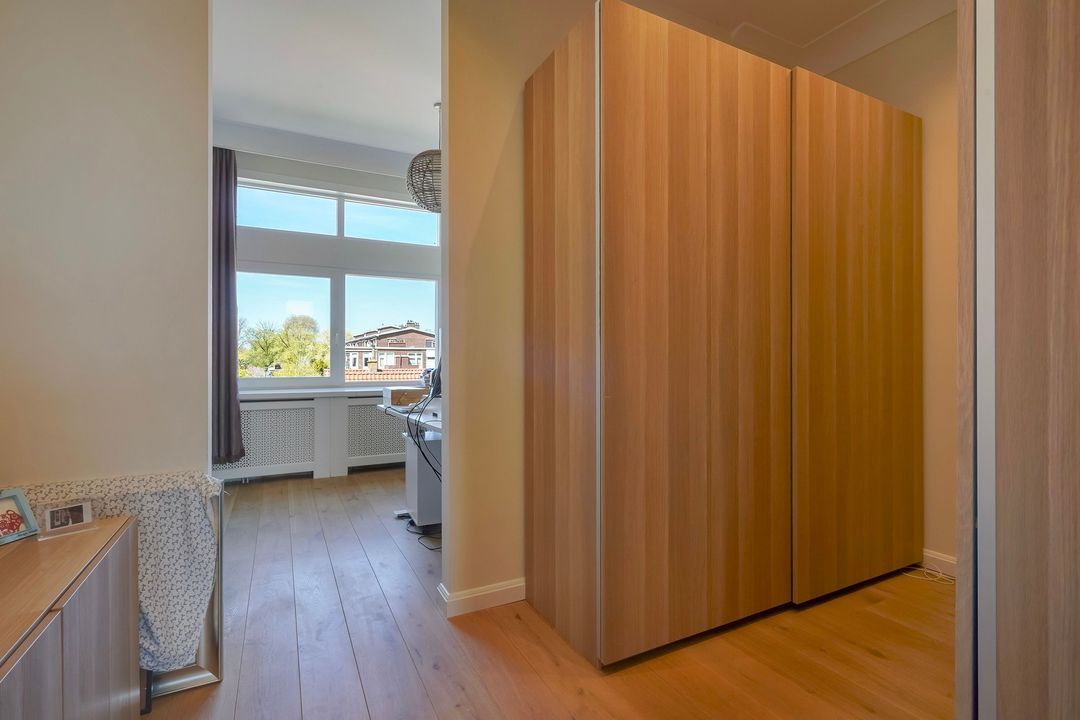 Beautiful open porch, entrance with original front door on the 1st floor. Vestibule with wardrobe and space under the stairs for, for example bicycles, stairs to the 2nd floor, spacious hallway with sand-colored floor tiles; cupboard space above the stairwell, laundry room with wall-mounted cabinets and the central heating combi boiler (Nefit 2022), modern toilet with hand basin, modern bathroom with walk-in (rain) shower and vanity unit, a square front bedroom with a large window and unobstructed view over the Sportlaan, bright rear bedroom featuring a wall of wardrobes and French doors to a balcony; intermediate modern 2nd bathroom with walk-in (rain)shower, bathtub and vanity unit, rear bedroom with a large, partially covered balcony and an open passageway to an (intermediate) dressing room; front bedroom/study with a sandstone fireplace with a gas fireplace. The bedrooms have wooden floorboards.