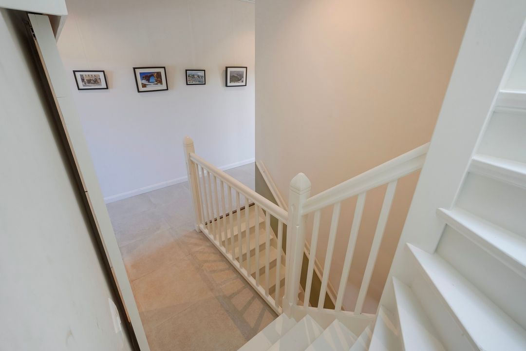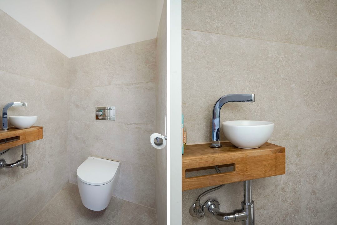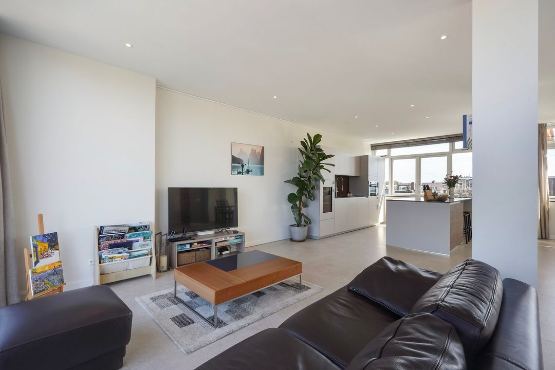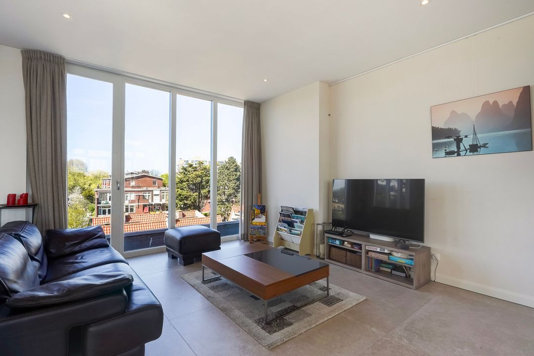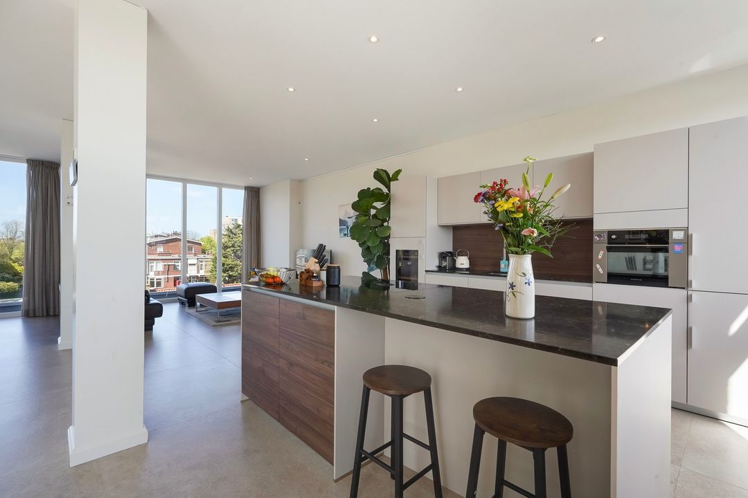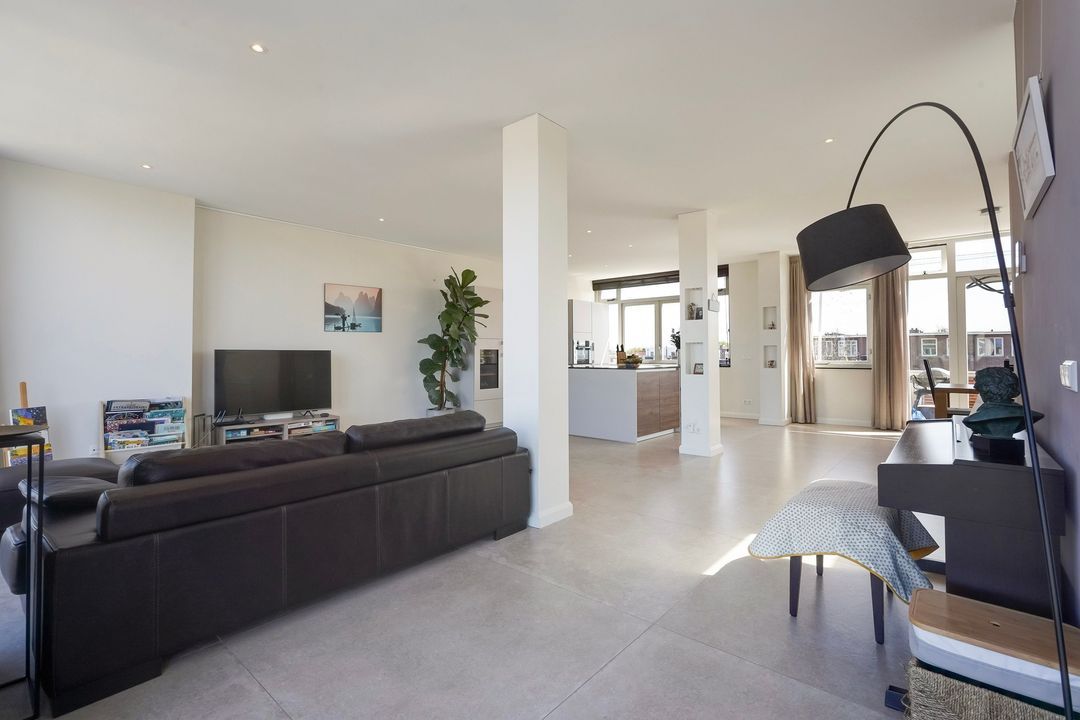 Beautiful living room with a skylight above the stairs, large sand-colored floor tiles, a modern toilet with a hand basin and a luxurious open kitchen featuring a kitchen island and a kitchen unit equipped with an induction hob (Bora), dishwasher, wine cabinet, oven, fridge/freezer (3 drawers) and a composite countertop with a marble look. The front of this rooftop extension is almost entirely made of glass, providing a fantastic unobstructed view over the Sportlaan. At the rear, French doors open onto a sunny roof terrace with a view of The Hague skyline. The entire floor features underfloor heating.