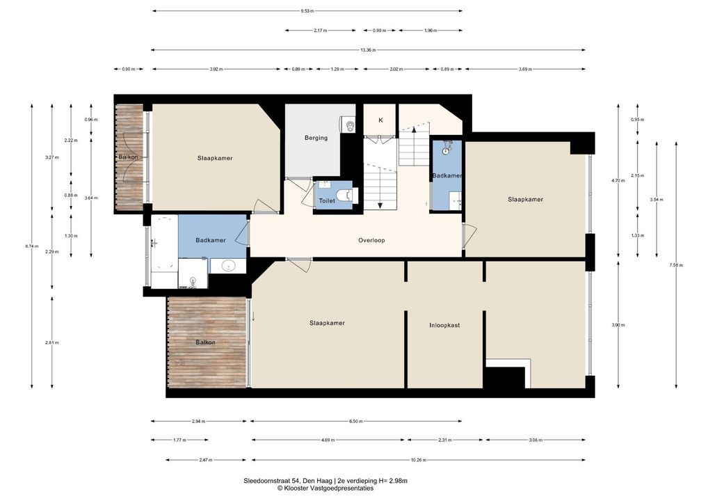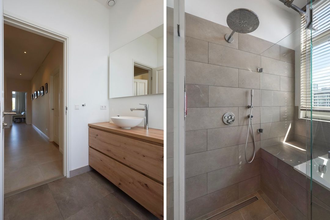 Beautiful open porch, entrance with original front door on the 1st floor. Vestibule with wardrobe and space under the stairs for, for example bicycles, stairs to the 2nd floor, spacious hallway with sand-colored floor tiles; cupboard space above the stairwell, laundry room with wall-mounted cabinets and the central heating combi boiler (Nefit 2022), modern toilet with hand basin, modern bathroom with walk-in (rain) shower and vanity unit, a square front bedroom with a large window and unobstructed view over the Sportlaan, bright rear bedroom featuring a wall of wardrobes and French doors to a balcony; intermediate modern 2nd bathroom with walk-in (rain)shower, bathtub and vanity unit, rear bedroom with a large, partially covered balcony and an open passageway to an (intermediate) dressing room; front bedroom/study with a sandstone fireplace with a gas fireplace. The bedrooms have wooden floorboards.