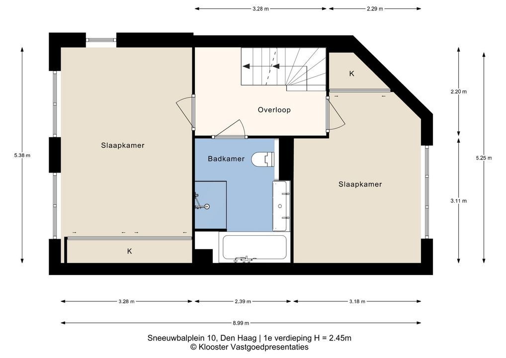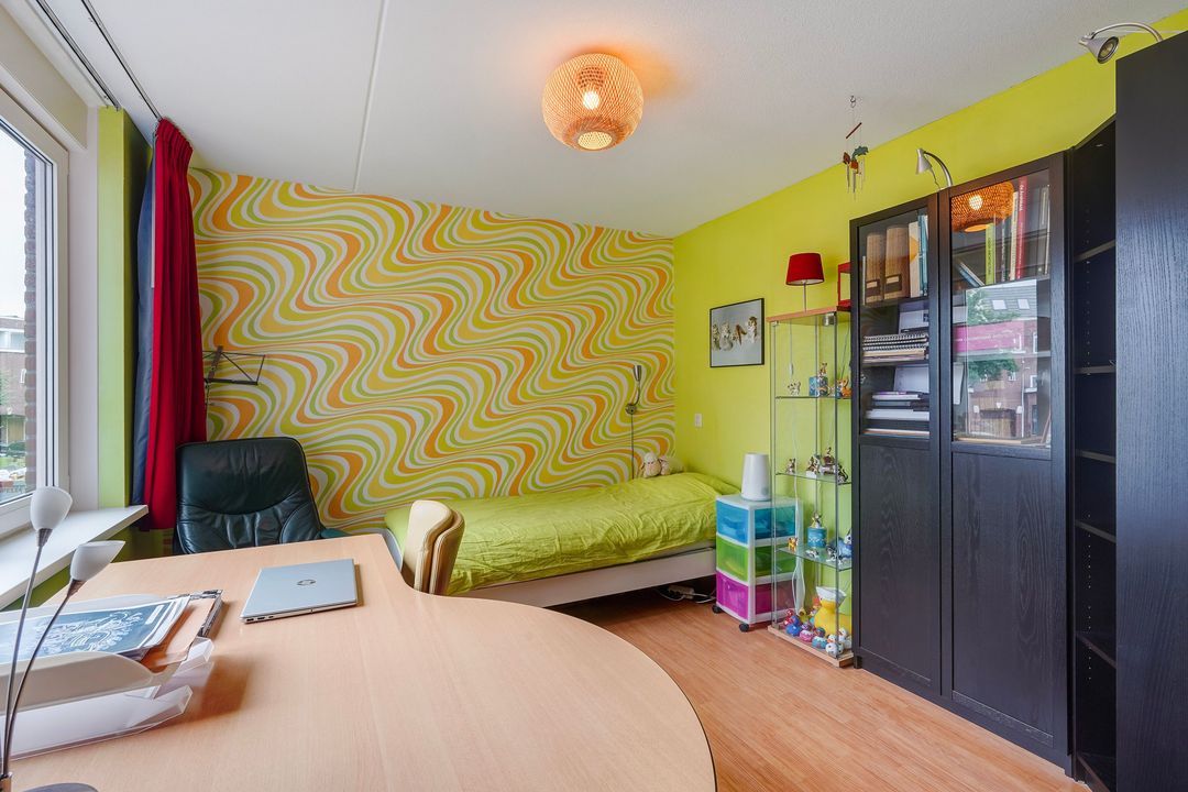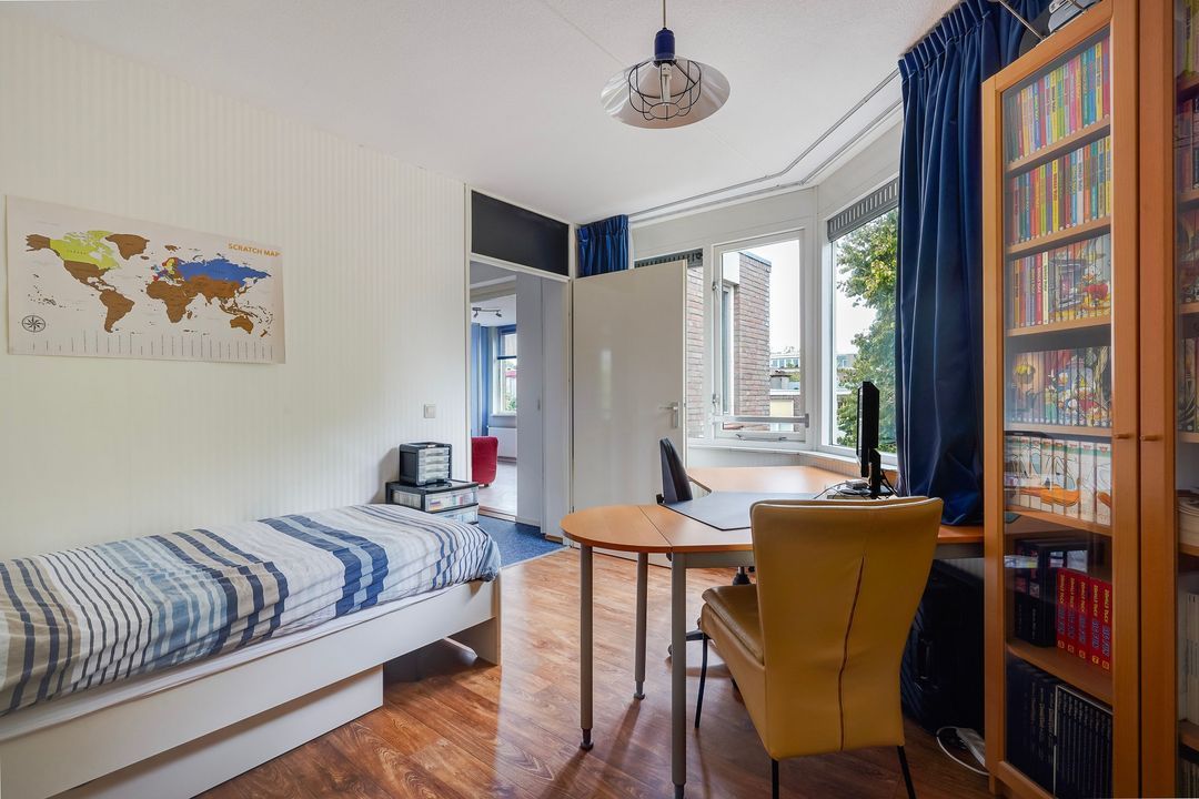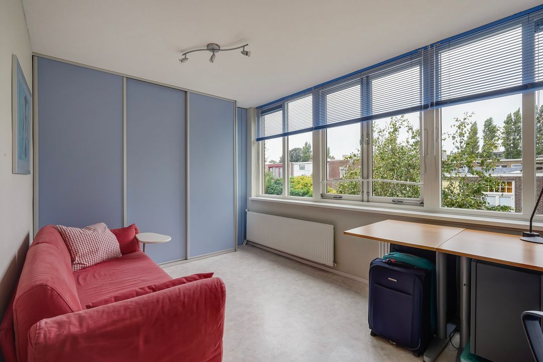 Lichte voorslaapkamer met kastenwand en vrij uitzicht op het plein, ruime achterslaapkamer met kastenwand en vrij uitzicht op de tuin.