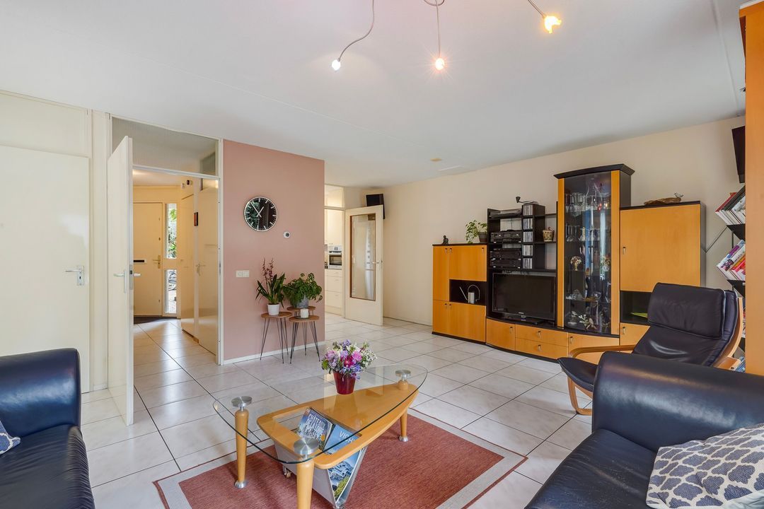 Ruime, lichte en brede woon/eetkamer gelegen aan de achterzijde met convectorput en bergruimte in de trappenkast.