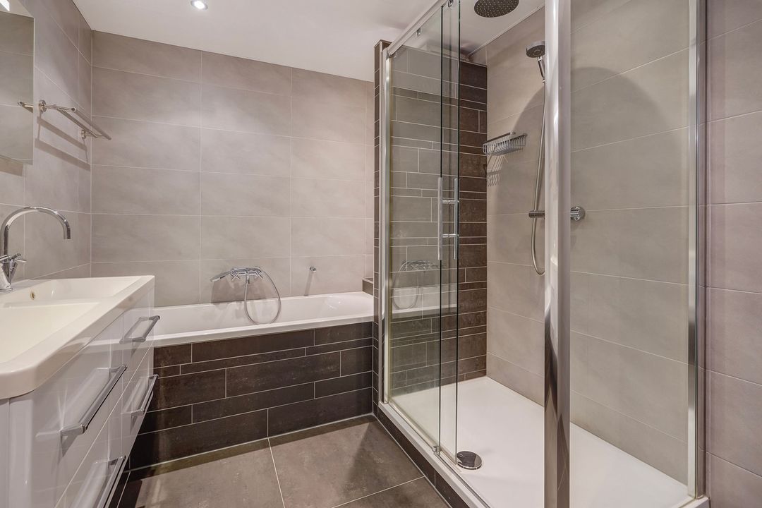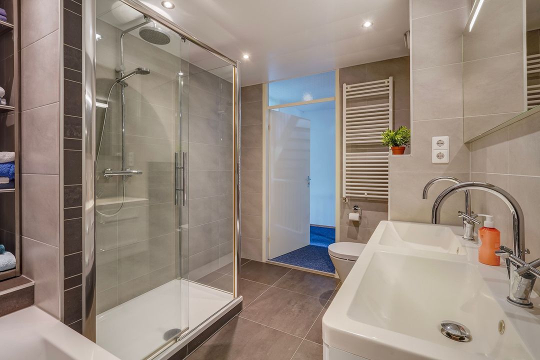 Landing, connecting modern, fully tiled bathroom with a bathtub, spacious walk-in shower, second toilet, double vanity and design radiator.