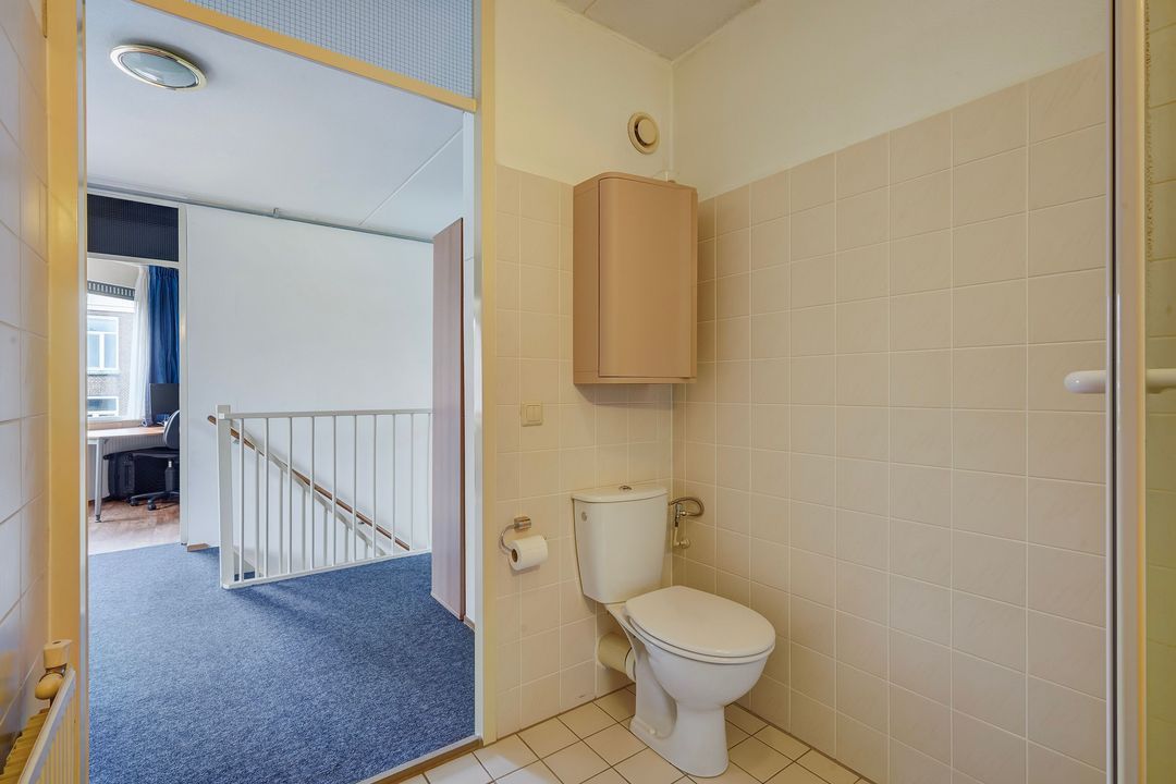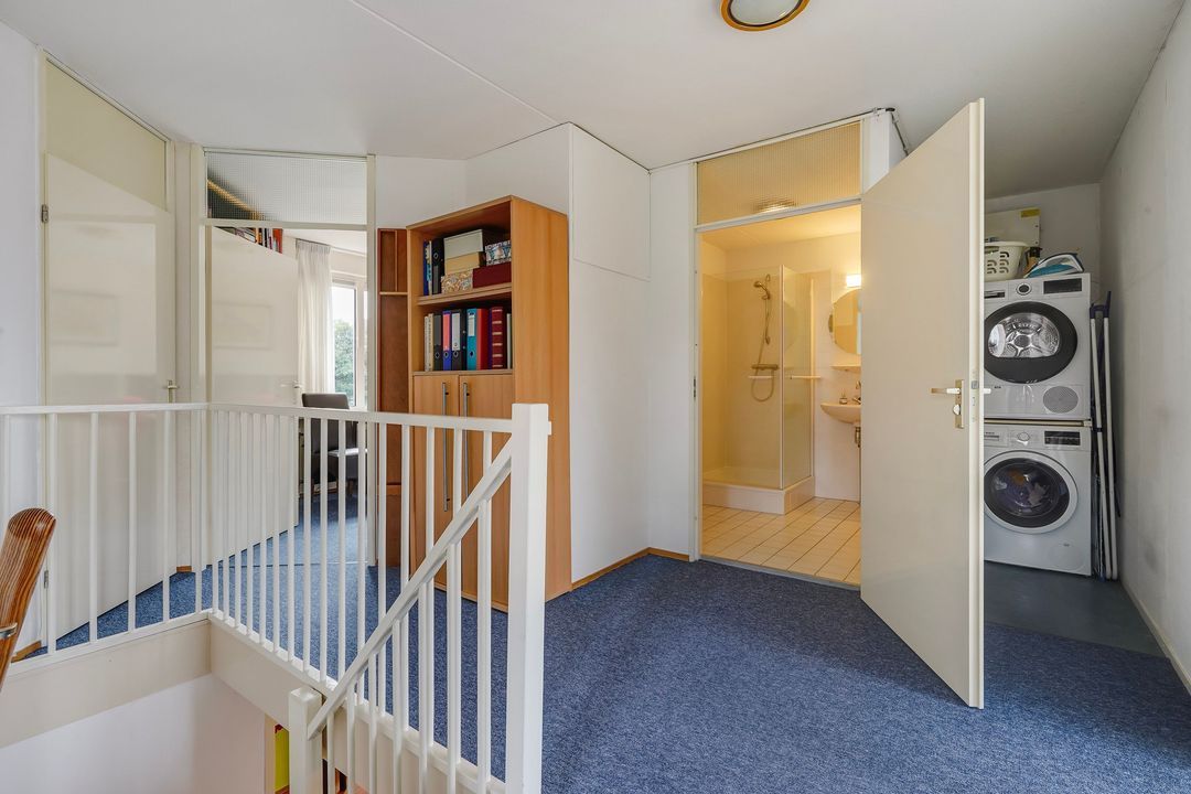 Ruime overloop met aansluitingen voor wasmachine- en droger en omvormer en vaste kast met opstelplaats cv-ketel. Tussengelegen badkamer voorzien van douchecabine, wastafel en 3e toilet.