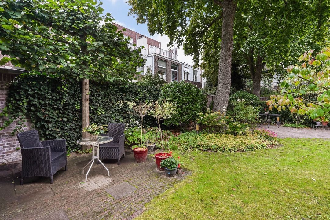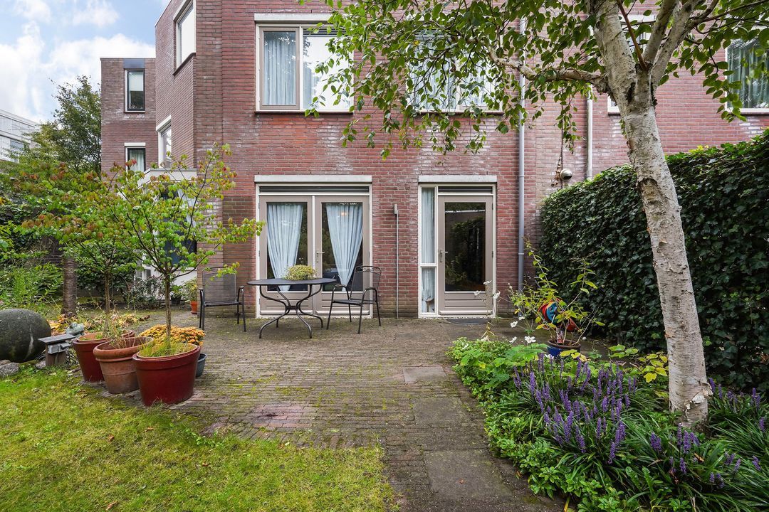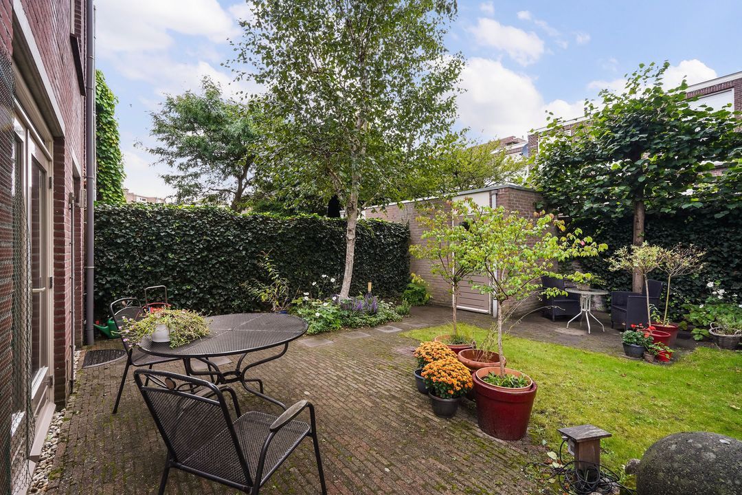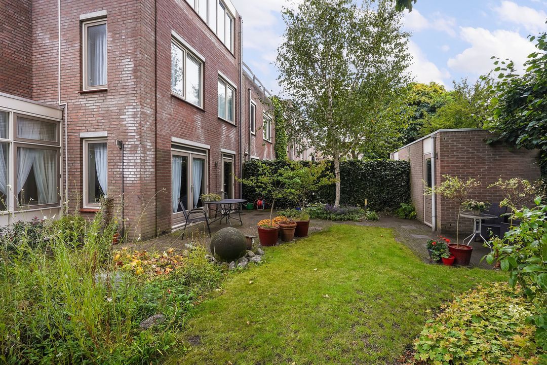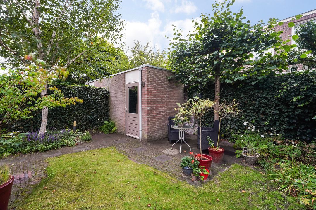 Via openslaande en 2 deuren toegang tot de riante, fraai aangelegde achtertuin (ca. 135 m²), gelegen op het noordwesten voorzien van een stenen berging met elektra.