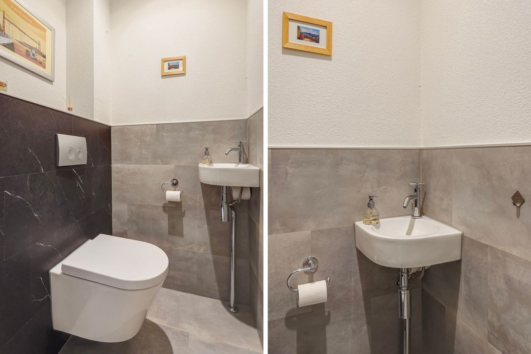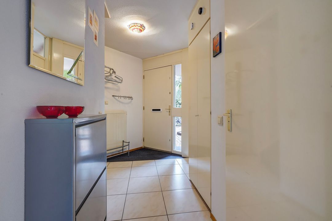 Via voortuin, entree van de woning, hal voorzien van plavuizen vloer met vloerverwarming doorgelegd op de begane grond, meterkast, separaat modern toilet met fontein.