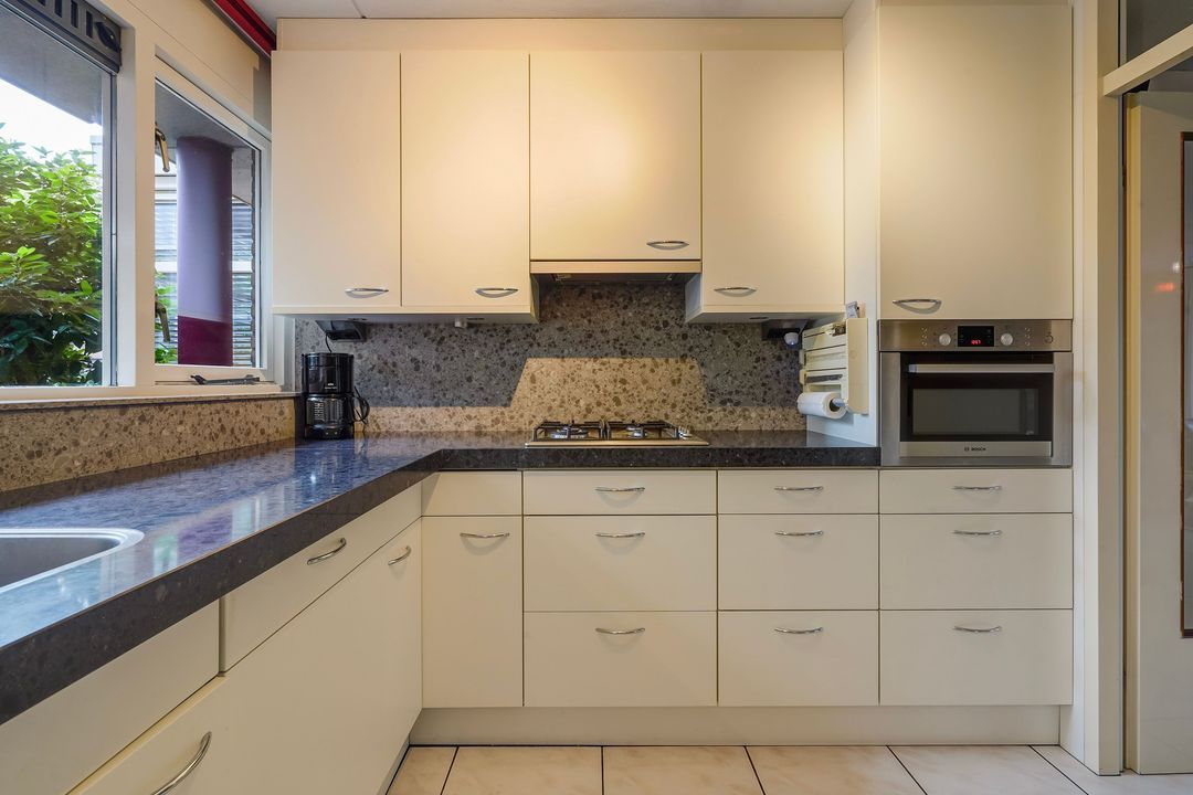 Aan de voorzijde gelegen, goed onderhouden half open keuken voorzien van L-vormig composiet aanrechtblad, 4-pits gasfornuis, afzuigkap, inbouwvaatwasser, combi-oven (merk Bosch) en veel opbergruimte.
