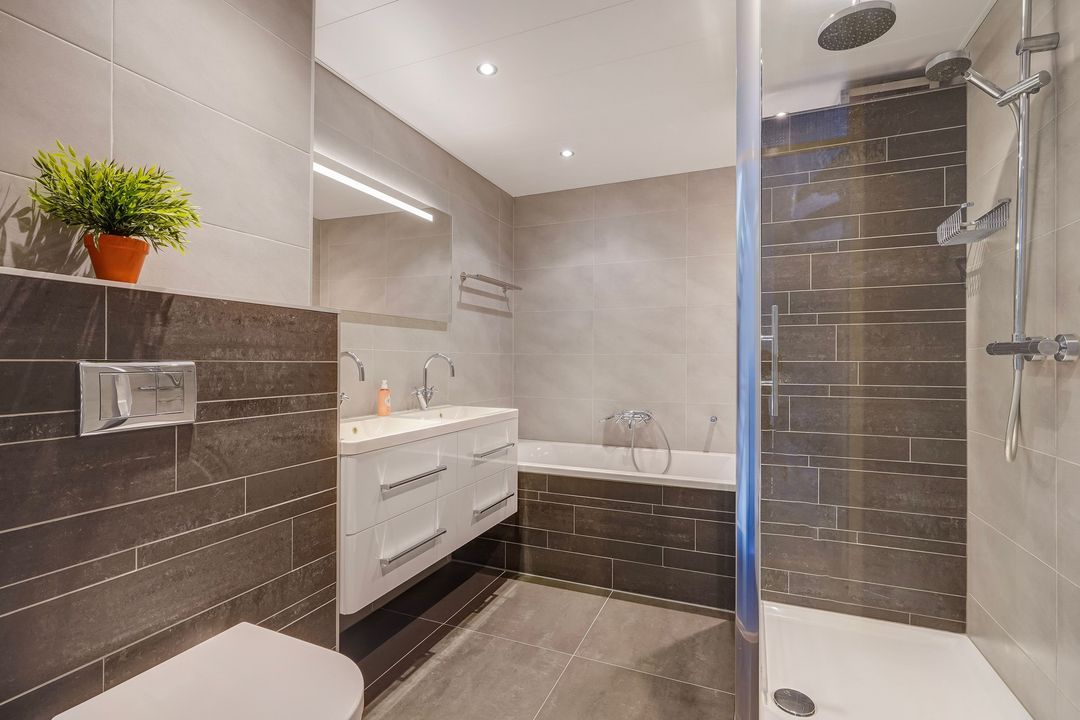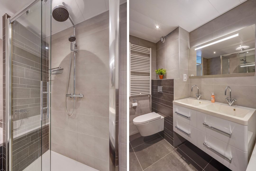 Overloop, tussengelegen moderne geheel betegelde badkamer voorzien van ligbad, ruime inloopdouche, 2e toilet, dubbel wastafelmeubel en designradiator.