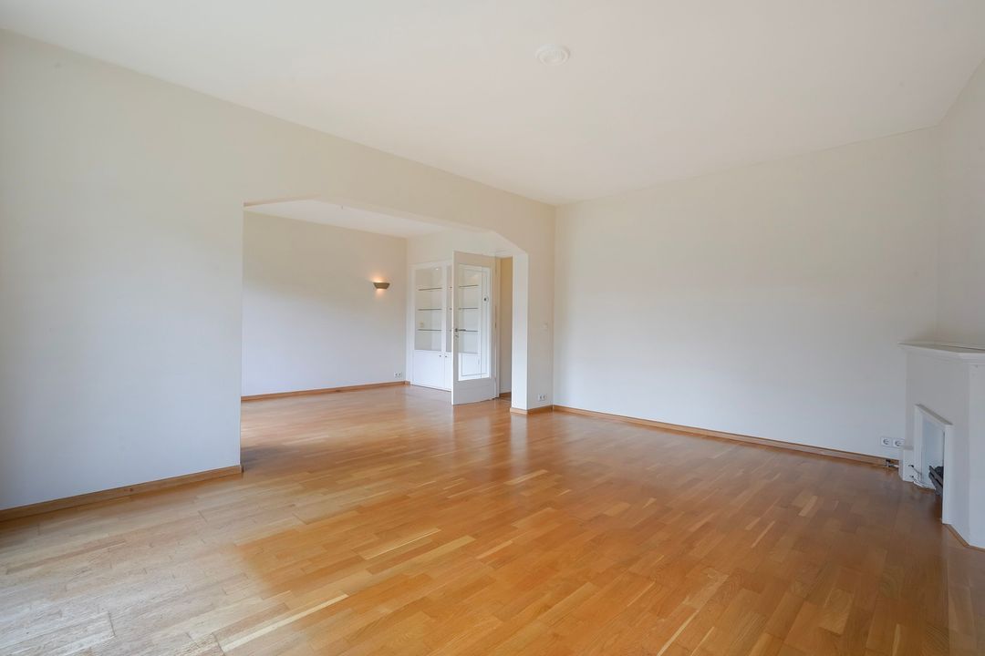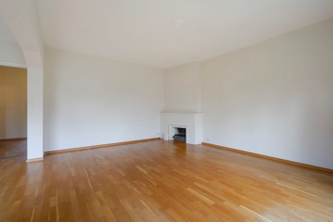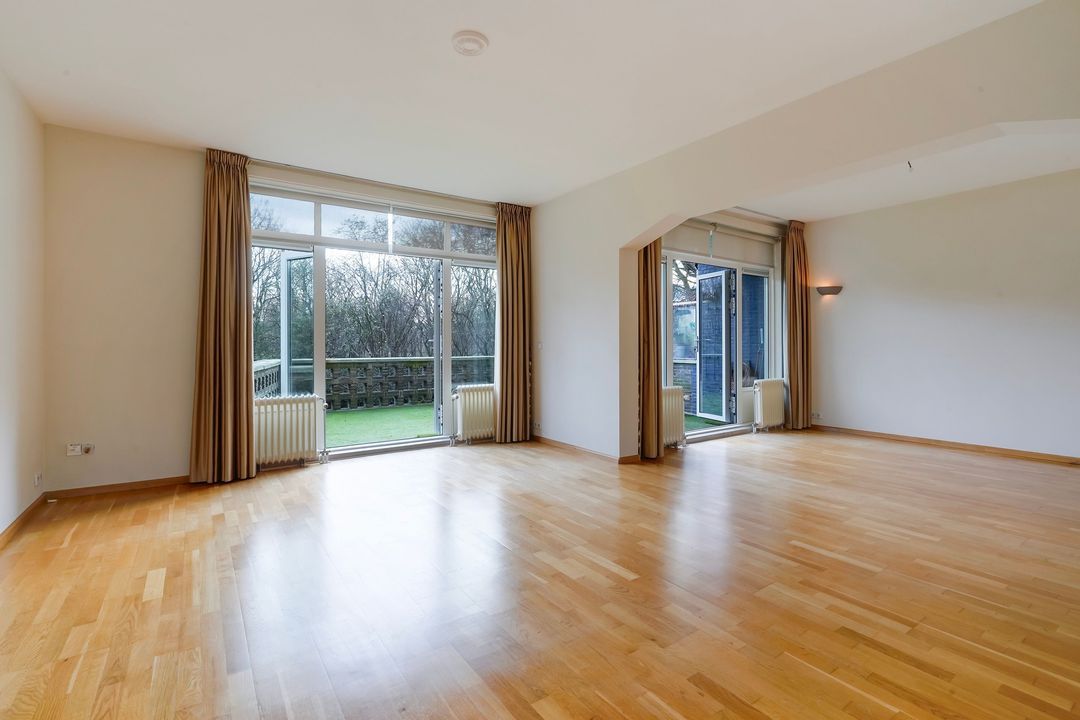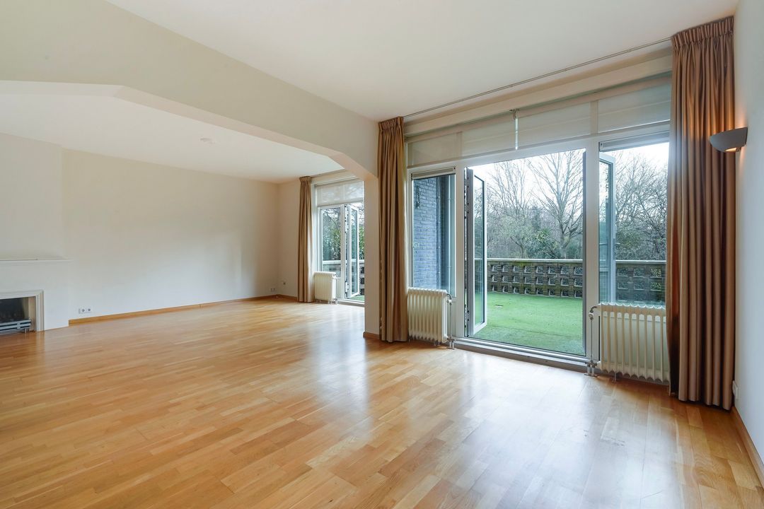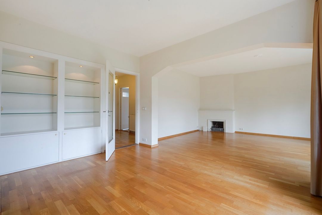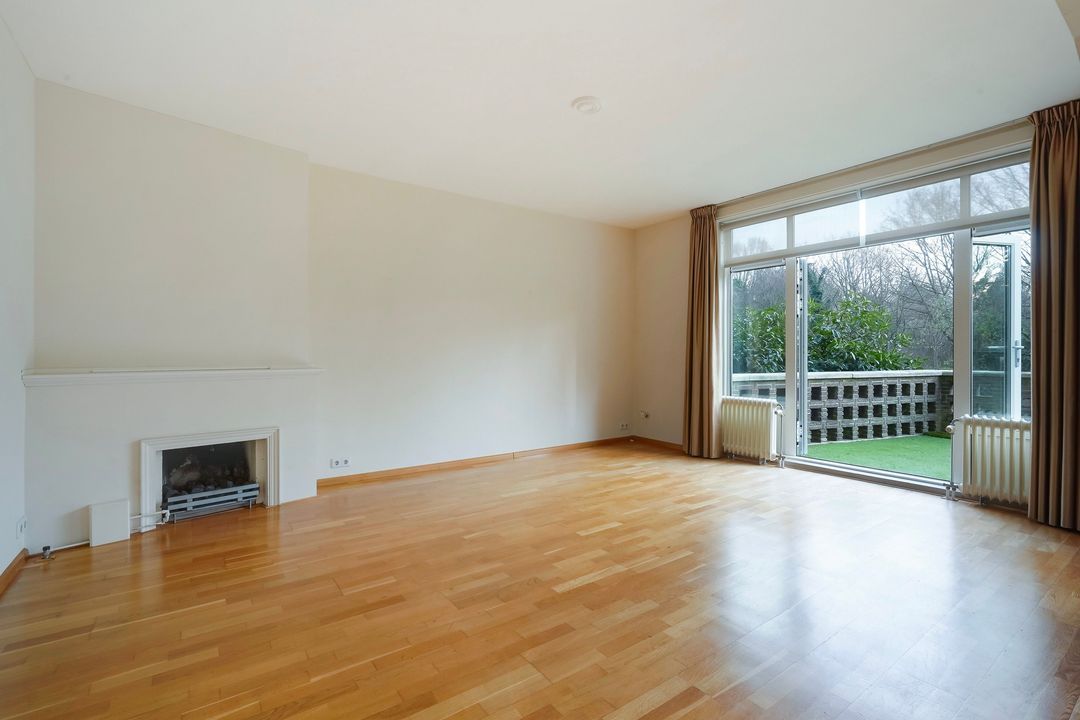Lichte woon-/eetkamer voorzien van gas open haard, 2 boekenkasten en openslaande deuren naar een groot zonnig terras grenzend aan het Segbroekplantsoen.
