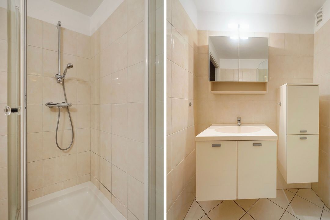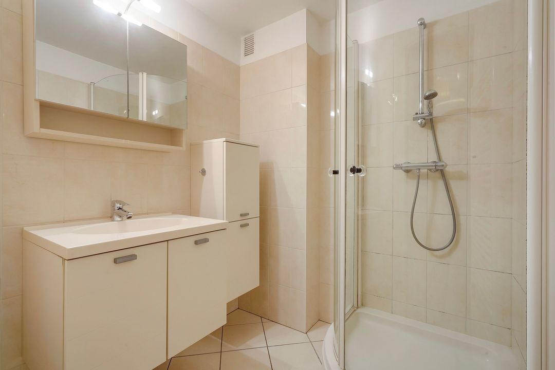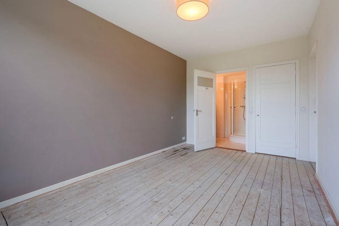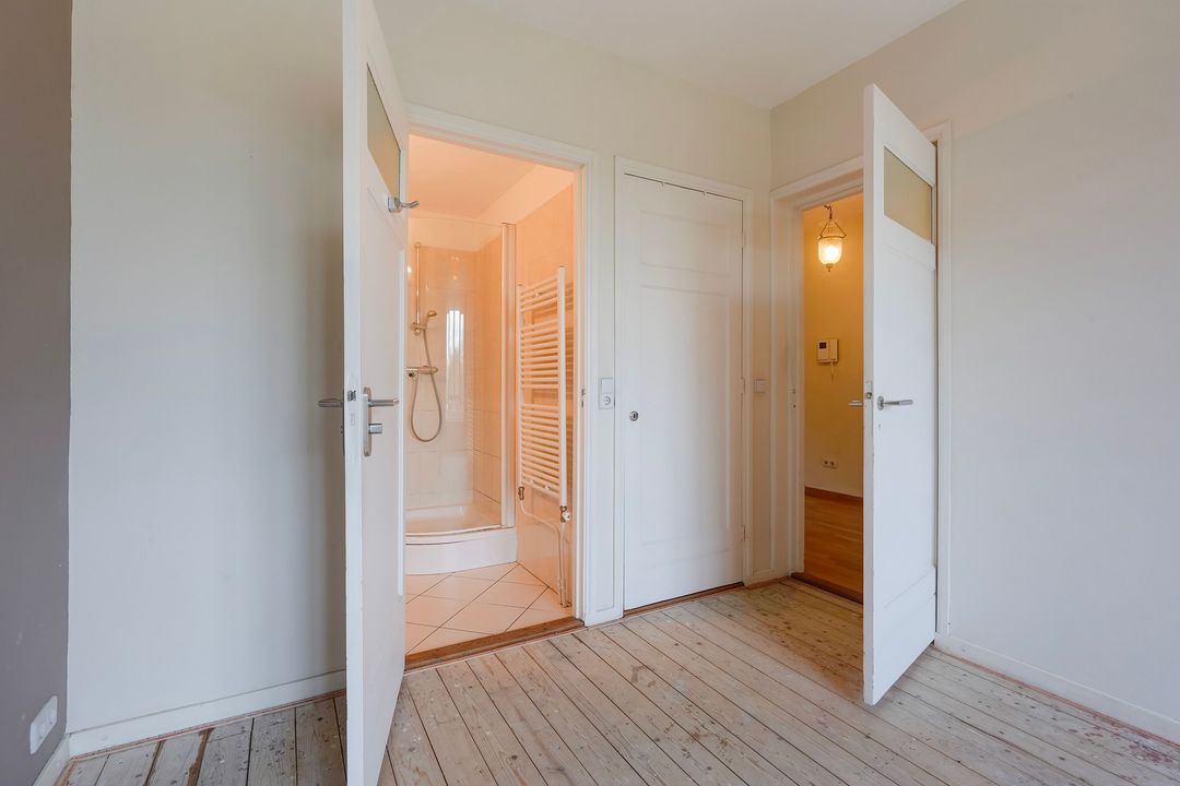 Voorslaapkamer met kastenwand, ruime voorslaapkamer voorzien van vaste kast annex nette badkamer voorzien van douchecabine en badkamermeubel.