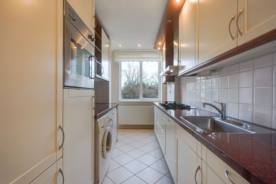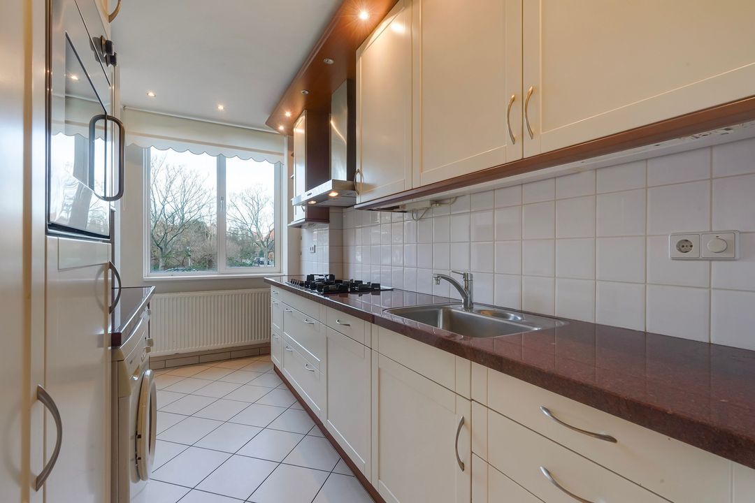 Nette keuken met bijgetrokken inpandig balkon voorzien van 2 keukenblokken met diverse inbouwapparatuur zoals, 5-pits gasfornuis, afzuigkap, koel-/vrieskast, oven, vaatwasser en wasmachine en droger.