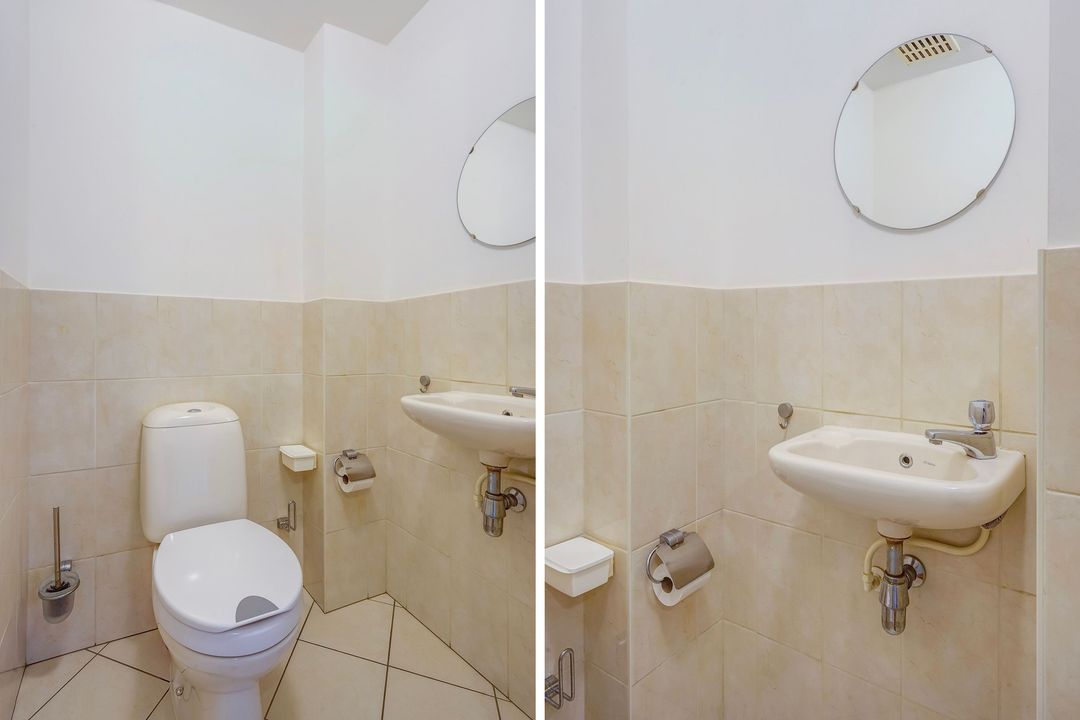 Entrance apartment, central hall with laminated parquet flooring extending into the living/dining room, alcove for the wardrobe with the meter cupboard, and a spacious toilet with a hand basin.