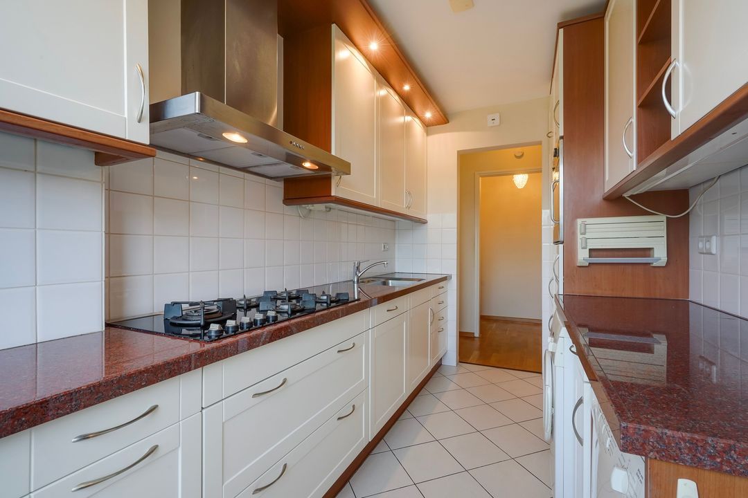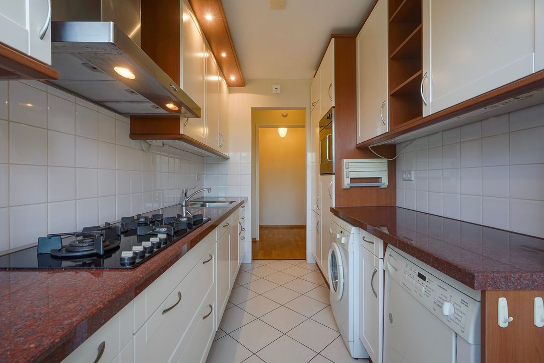 Neat kitchen with an integrated balcony featuring two kitchen units with various built-in appliances, including a 5-burner gas stove, extractor hood, refrigerator/freezer, oven, dishwasher, washing machine, and dryer.