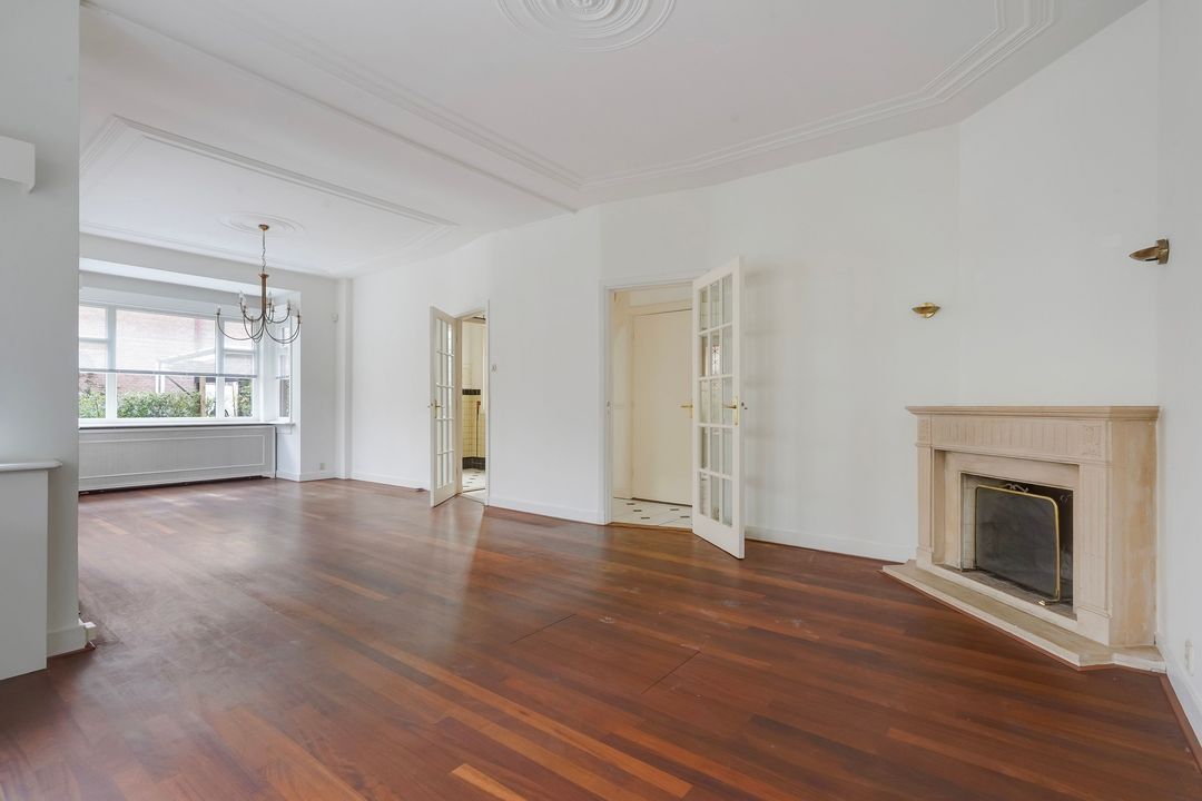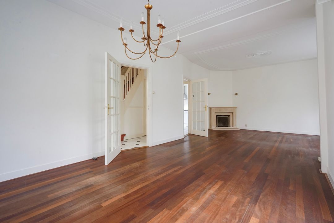 L-vormige woon-/eetkamer met grote erker, openhaard, parketvloer en openslaande deuren naar zonnige voortuin.