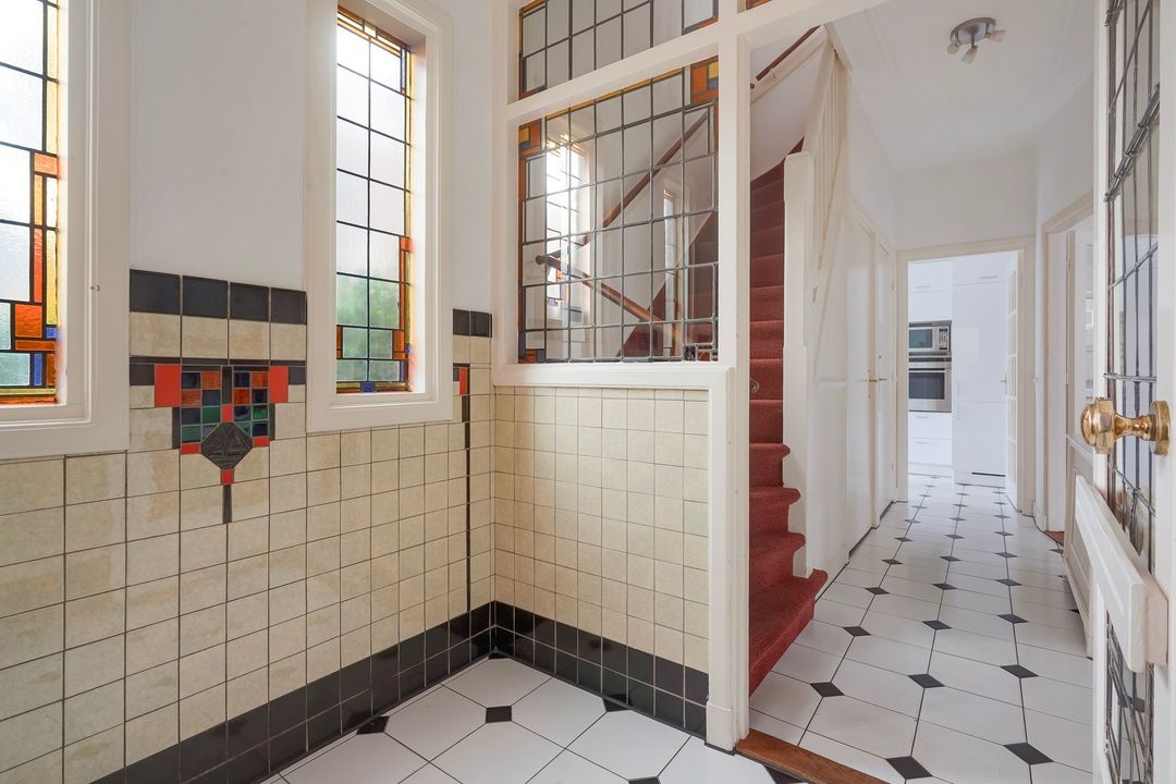 Via looppad naar entree met portaal in boogvorm, ruime vestibule met tochtdeurseparatie van glas-in-lood en zwart-wit tegelvloer doorgelegd naar de gang, toilet met vrijhangend reservoir en fontein, ruime kelder met opstelplaats c.v.-combiketel.