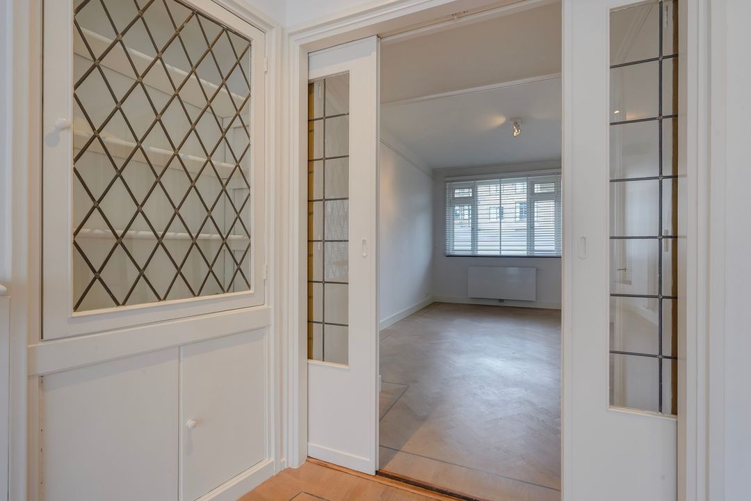 Via houten deur met glas toegang tot de bijzonder sfeervolle woonkamer en suite met eikenhouten parketvloer, schuifseparatie met glas in lood, 2 vaste kasten en nieuwe radiatoren. Aan de straatzijde gelegen eet/slaapkamer met vaste kast en toegang tot het voorbalkon, gelegen op het noordoosten, met ochtendzon en vrij uitzicht op het groen.