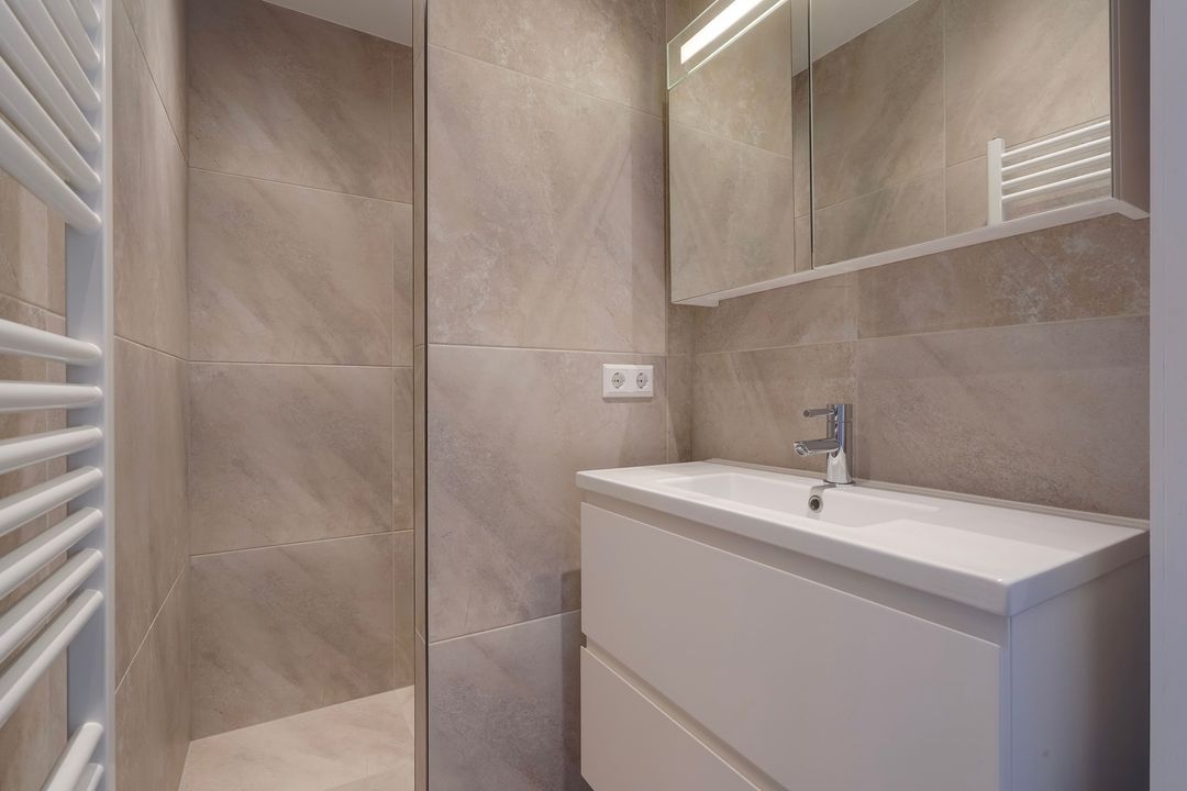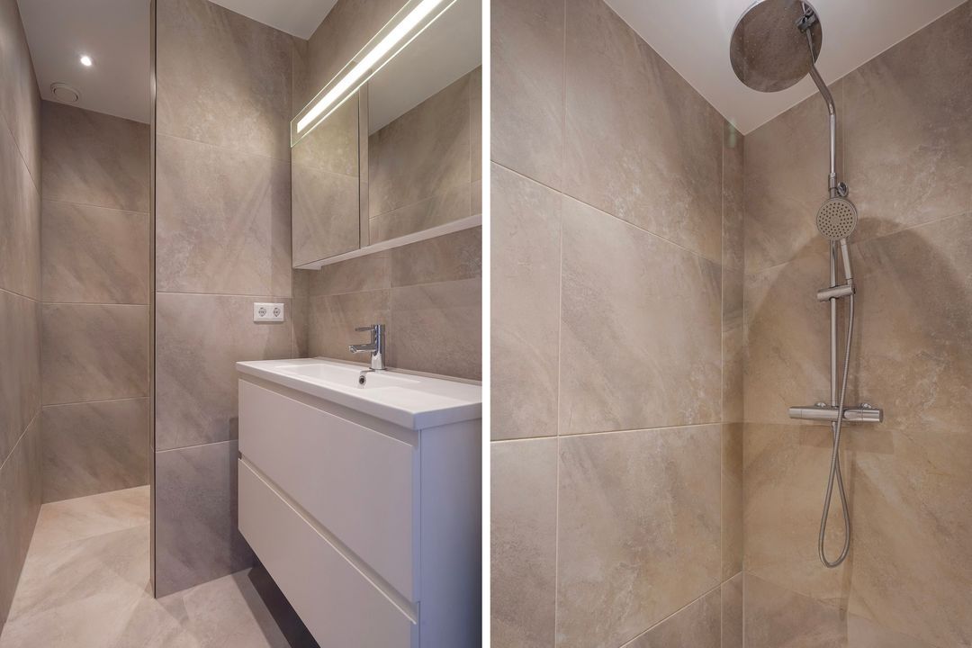 Separaat, ruim en modern toilet met fonteinmeubel. Luxe, fraai geheel betegelde badkamer voorzien van ruime inloop(regen)douche, wastafelmeubel, spiegelkast met LED-verlichting en handdoekradiator.