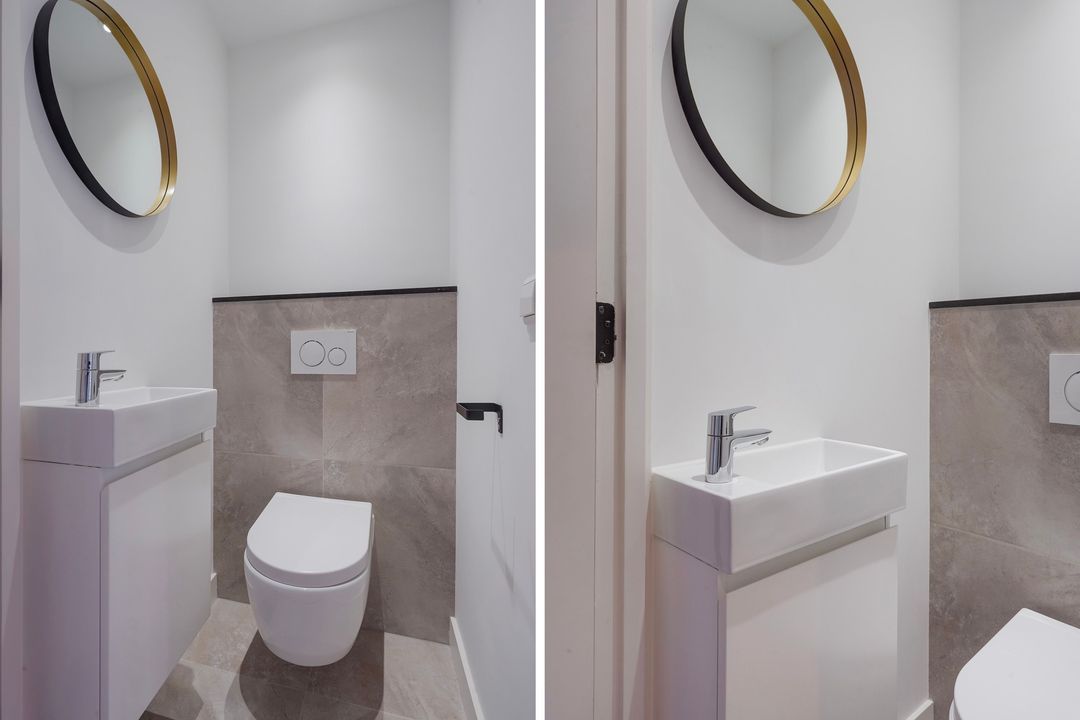 Separate, spacious, and modern toilet with a vanity unit. Luxurious, beautifully tiled bathroom with a spacious walk-in (rain) shower, vanity, mirrored cabinet with LED lighting, and a heated towel rail.