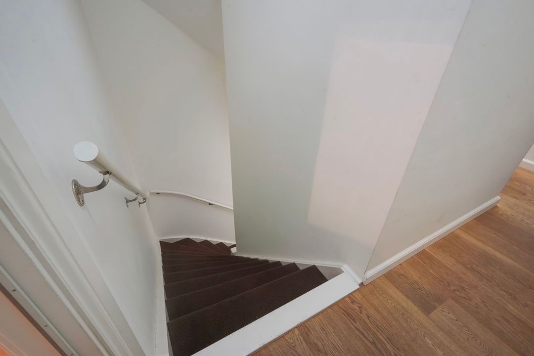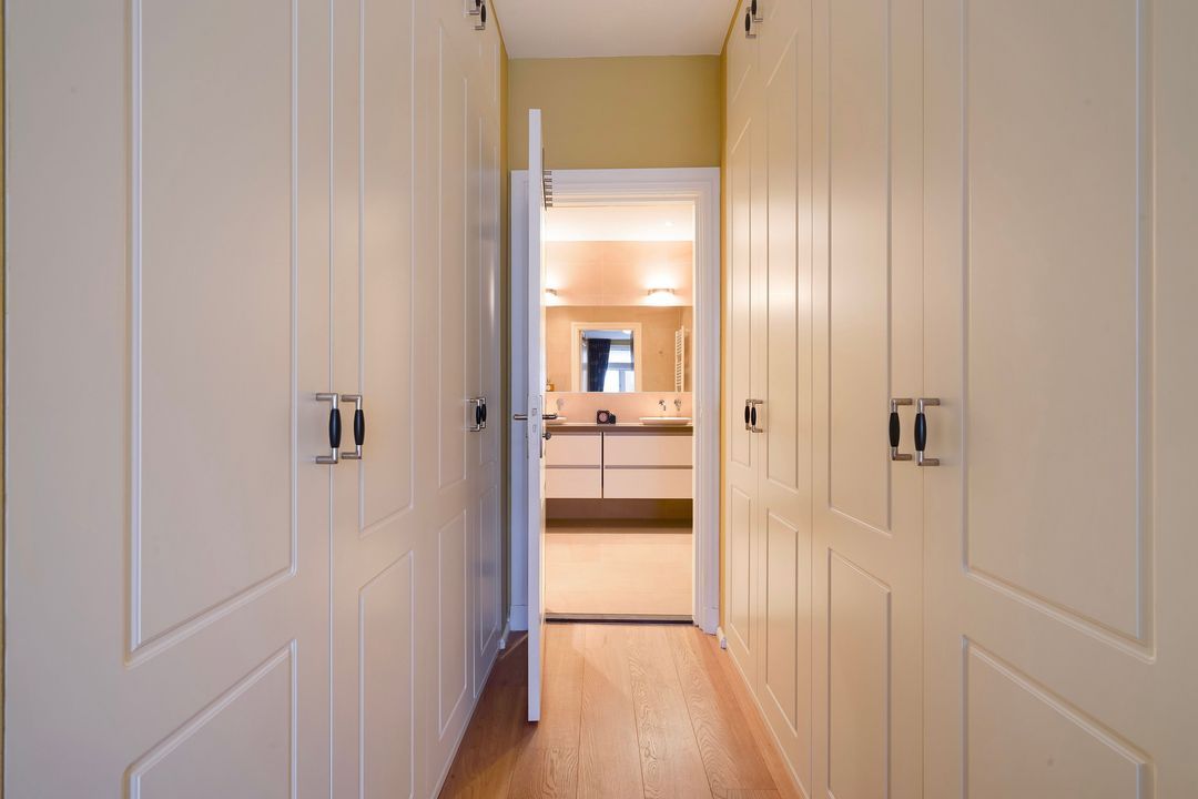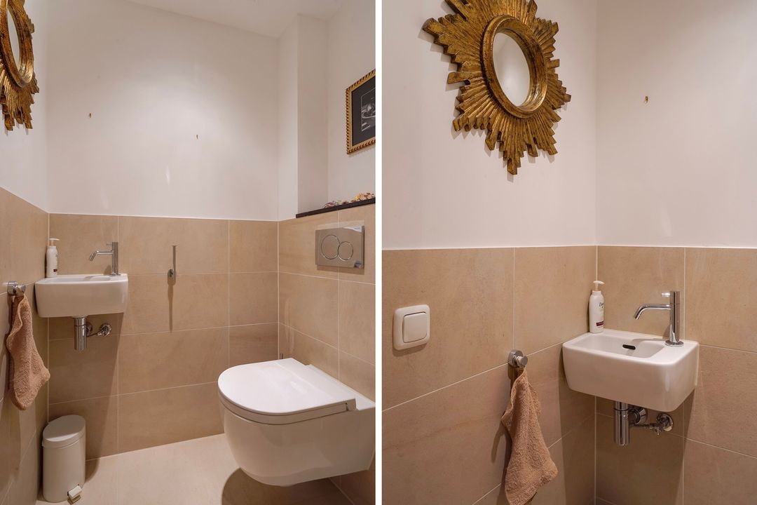 The apartment entrance is on the second floor. A hallway features herringbone parquet flooring with a border extending into the living/dining room. A built-in closet houses the connection of the washing machine and the position of the central heating boiler. A modern toilet with a hand basin.