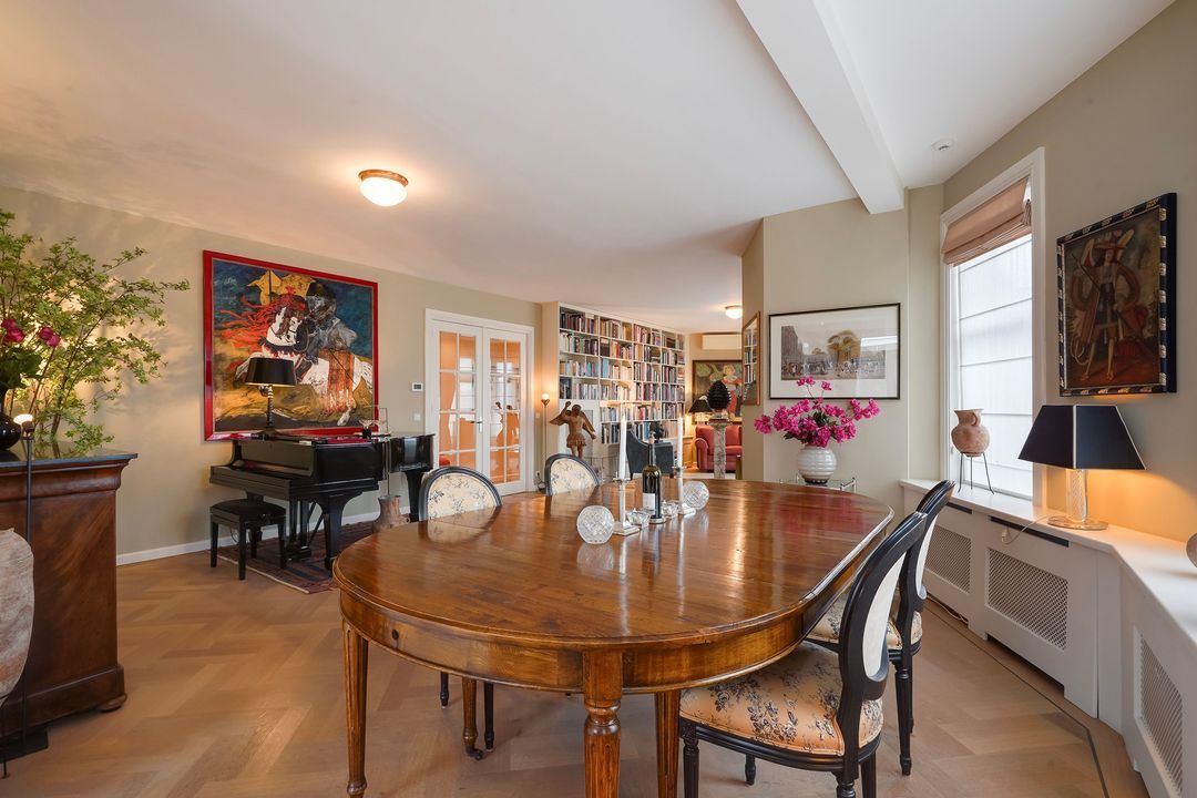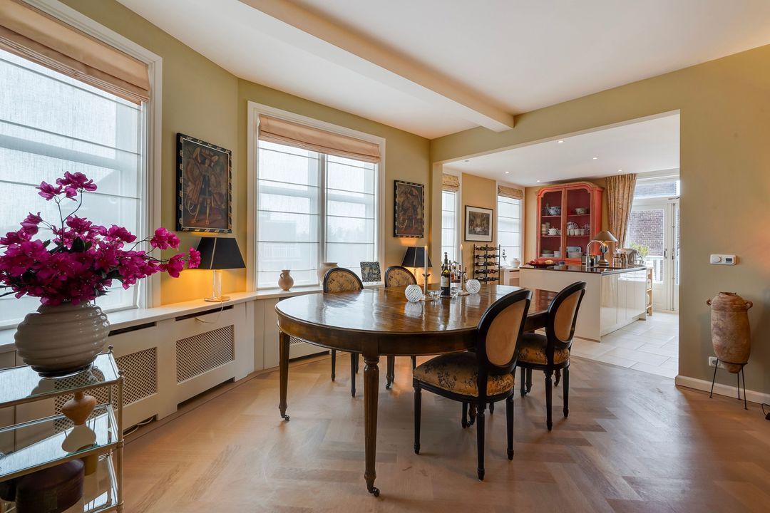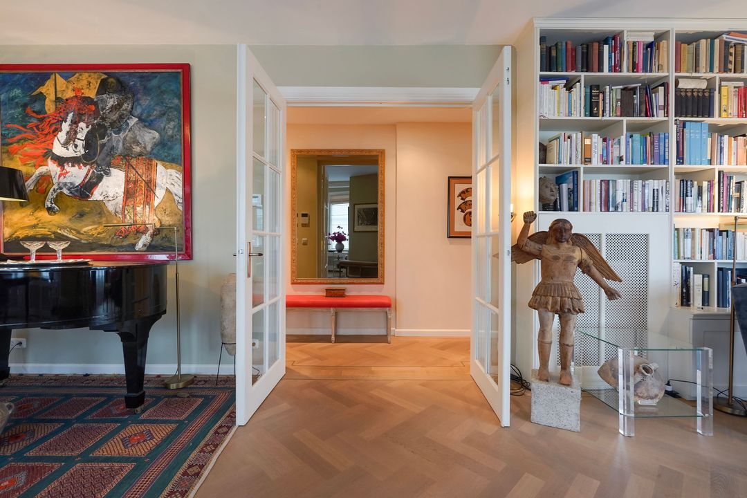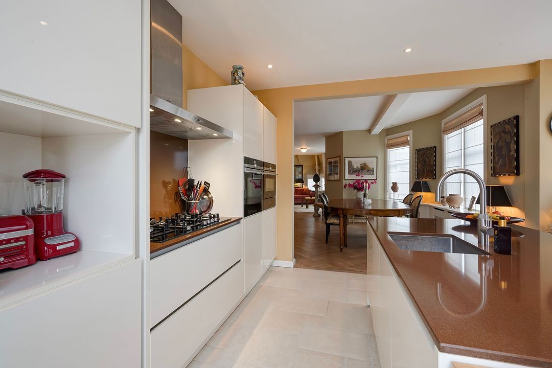 From the hallway, French doors with glazing bars open into a charming living/dining room with a sandstone mantelpiece and wood-burning fireplace, air conditioning, a custom-made bookcase, French doors leading to a small balcony, and an open-plan kitchen featuring a sink island with a bar top, freezer, dishwasher, Quooker, food waste disposer, and a straight kitchen unit equipped with a 5-burner gas stove, combination microwave, warming drawer, oven, refrigerator, and extractor hood.