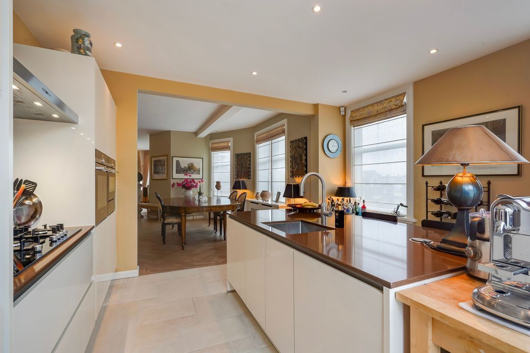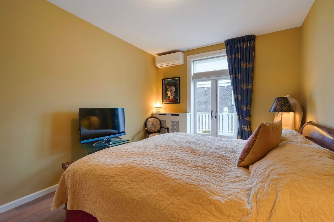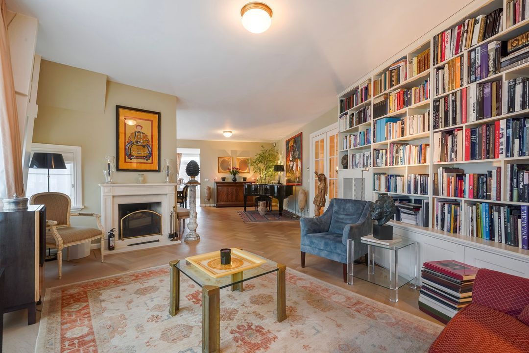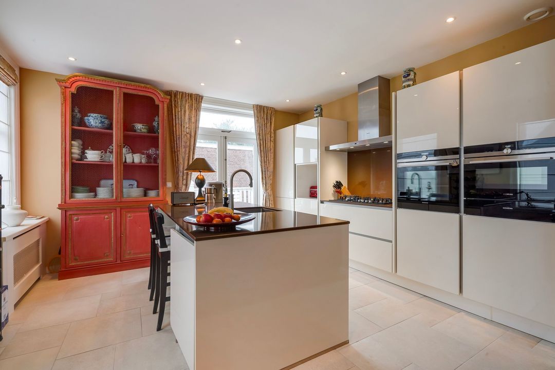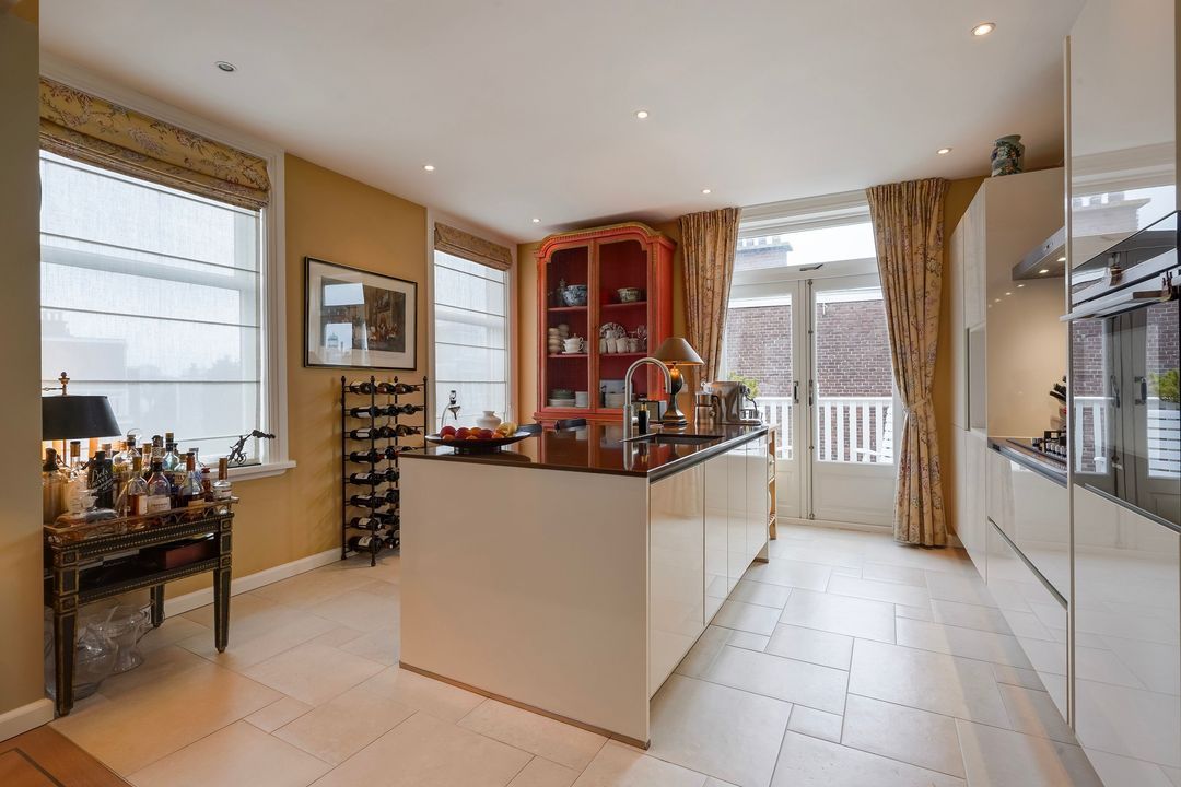 From the hallway, French doors with glazing bars open into a charming living/dining room with a sandstone mantelpiece and wood-burning fireplace, air conditioning, a custom-made bookcase, French doors leading to a small balcony, and an open-plan kitchen featuring a sink island with a bar top, freezer, dishwasher, Quooker, food waste disposer, and a straight kitchen unit equipped with a 5-burner gas stove, combination microwave, warming drawer, oven, refrigerator, and extractor hood.