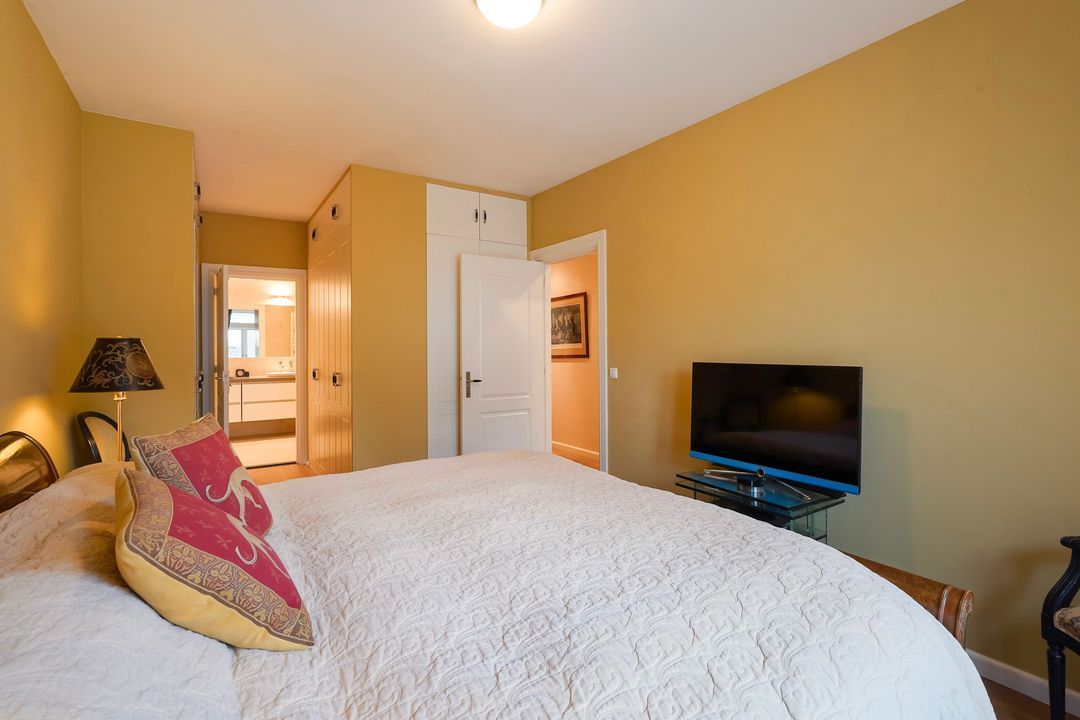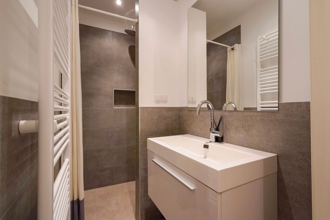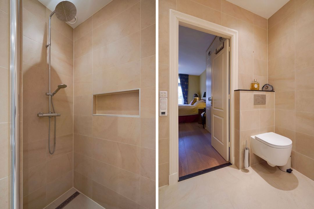 A bright front bedroom with air conditioning, a built-in closet, and a beautiful unobstructed view over the Statenlaan, a modern bathroom with a walk-in shower and vanity unit, bedroom at the rear with two wall closets, master bedroom features two wall closets, air conditioning, and French doors leading to a spacious balcony. Spacious modern bathroom ensuite with a double vanity, underfloor heating, a toilet, and a walk-in shower.