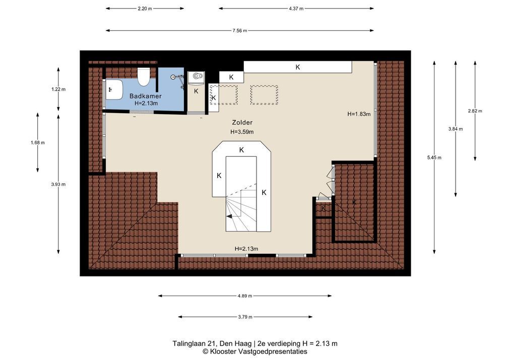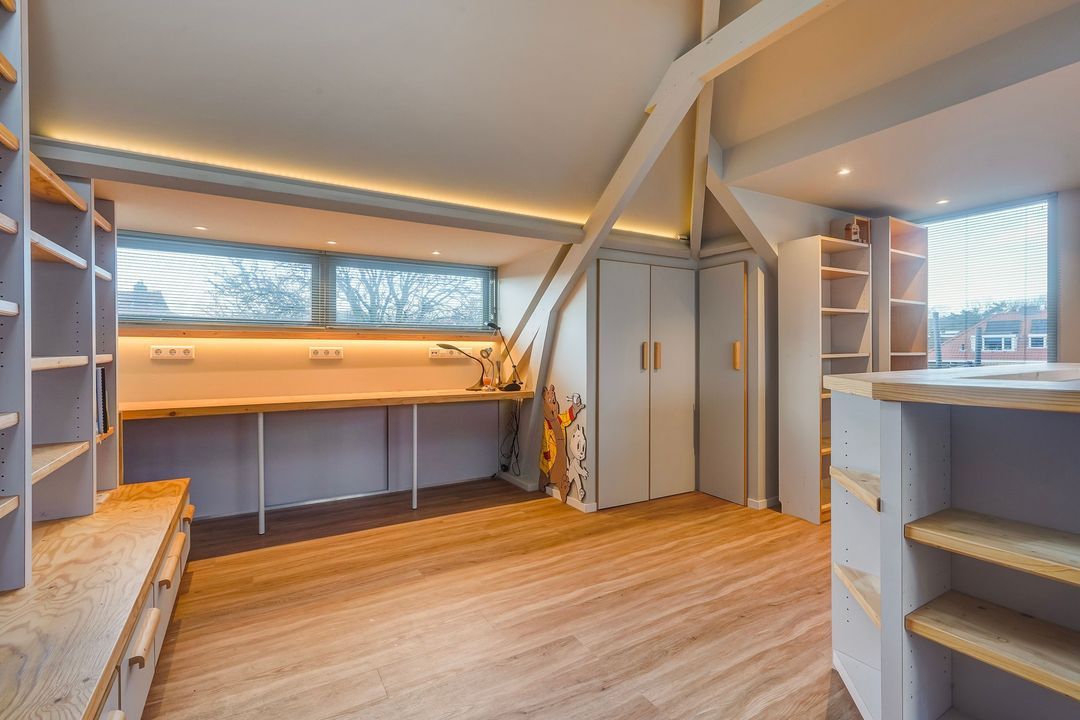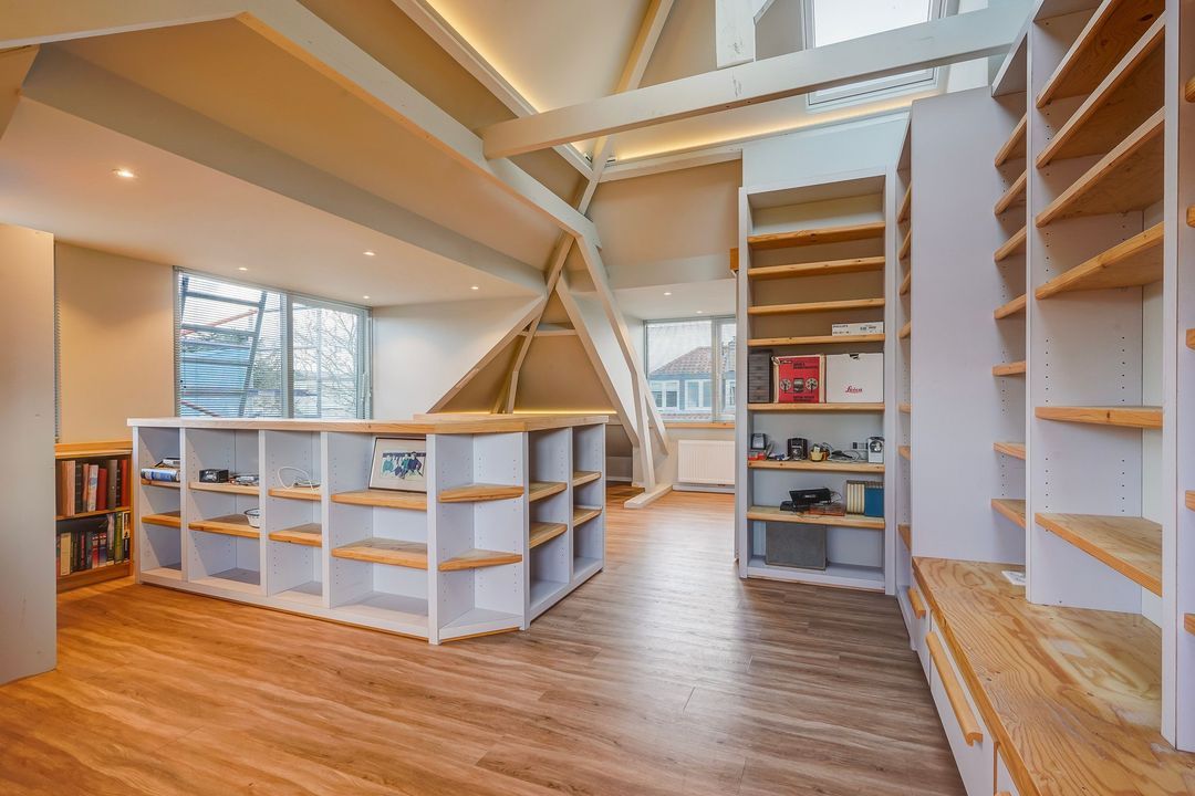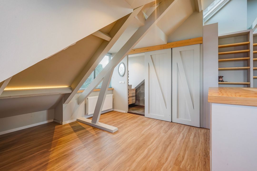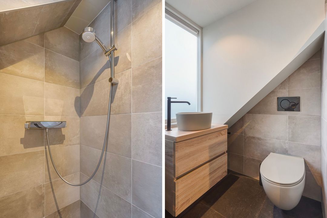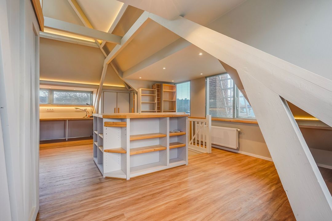 Eén grote prachtige zolderkamer met in elke dakschikschild een dakkapel, 2 dakramen, vaste kast en 2e moderne badkamer met wastafelmeubel, toilet en inloopdouche.