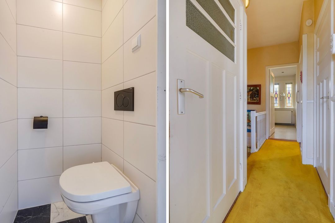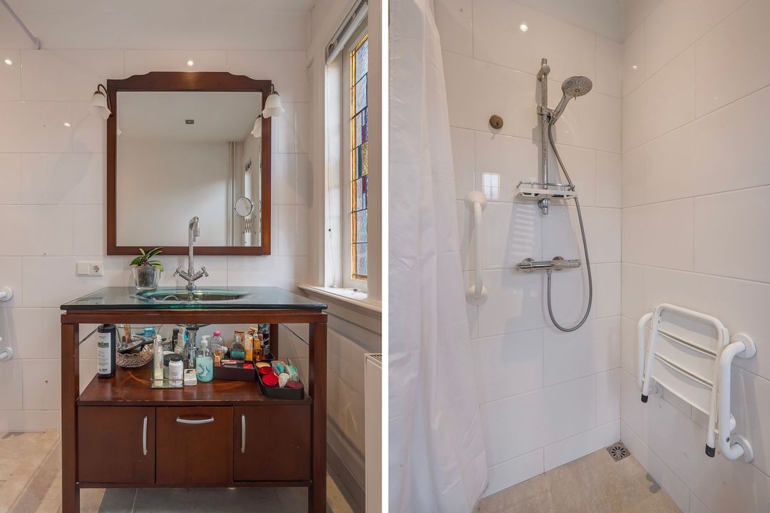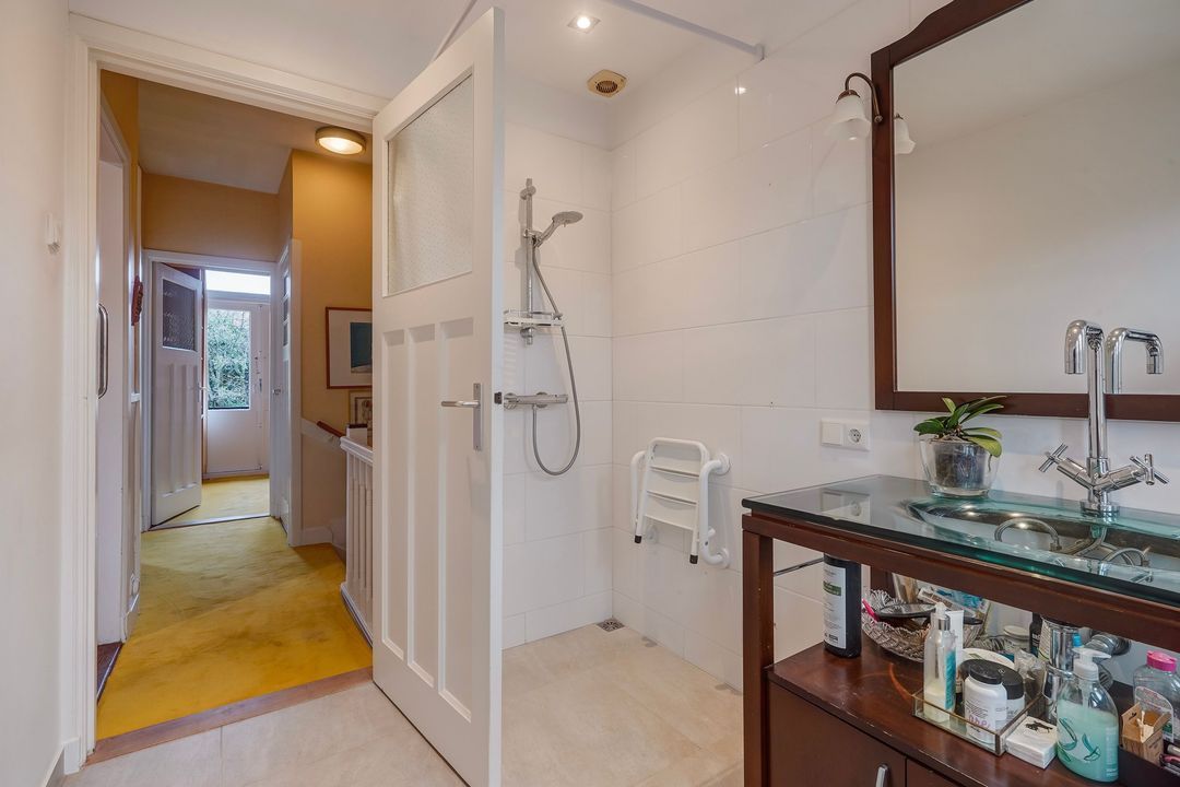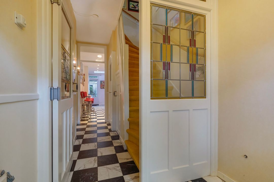 Entree met luifel, vestibule met een tochtseparatie met glas in lood en zwart/wit marmeren vloertegels over de gehele begane grond, verdiepte trappenkast, toilet met de originele wandtegels en fontein, sfeervol en uitgebouwde woon/eetkamer voorzien van zij- en achter aanbouw, voorerker, gas openhaard en veel daglicht toetreding door de vele ramen, uitgebouwde rode keuken met rvs aanrechtblad en diverse inbouw apparatuur zoals 4-pits gasfornuis, combi magnetron, koel-/vrieskast (3 laden) en wasmachine aansluiting. Prachtig aangelegde tuin voorzien van houten en stenen berging en diverse terrassen.