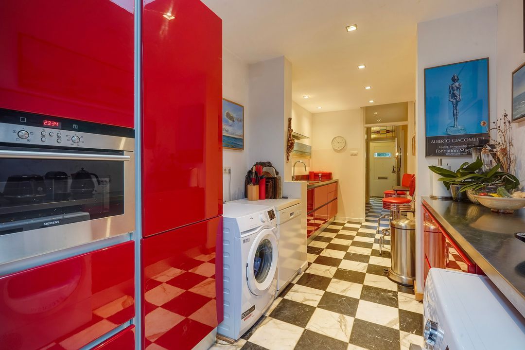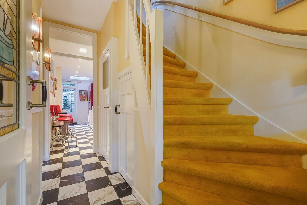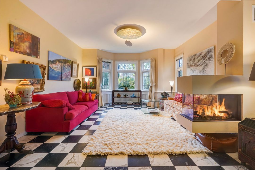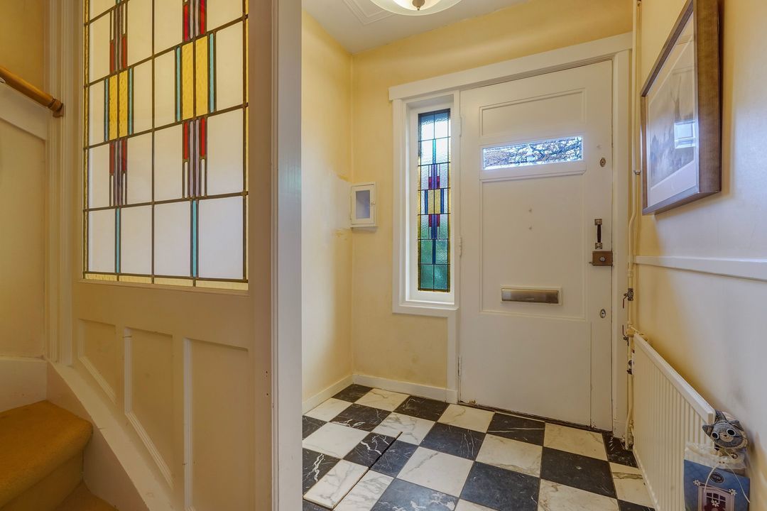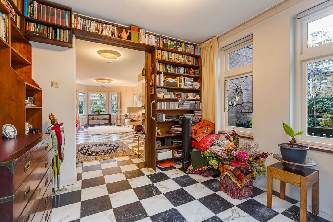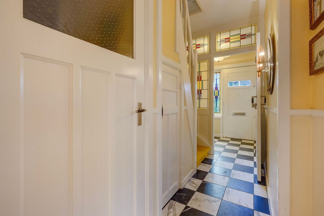 Entrance with awning, vestibule with a draft divider featuring stained glass and black and white marble floor tiles throughout the ground floor, recessed underneath stair cupboard, toilet with original wall tiles and a hand basin, attractive and extended living/dining room with side and rear extensions, front bay window, gas fireplace and lots of natural light through the many windows, extended red kitchen with stainless steel countertops and various built-in appliances such as a 4-burner gas stove, combination microwave, refrigerator/freezer (3 drawers) and washing machine connection. Beautifully landscaped garden with a wooden and stone shed and several patios.