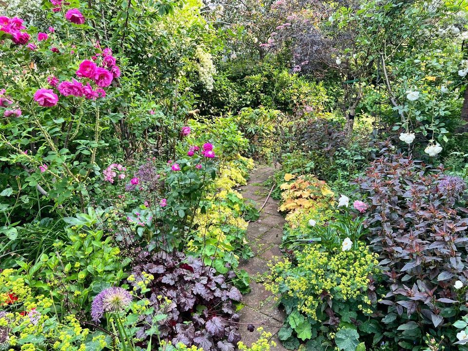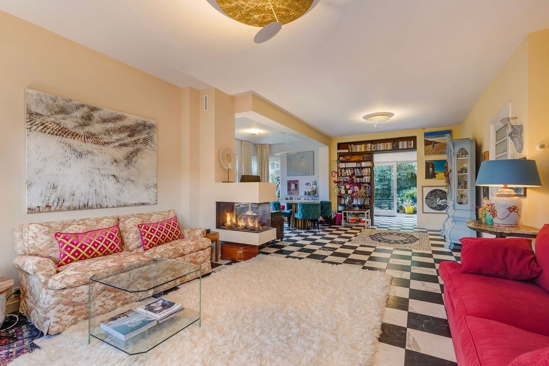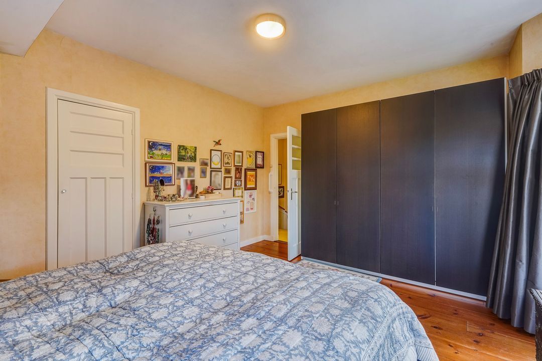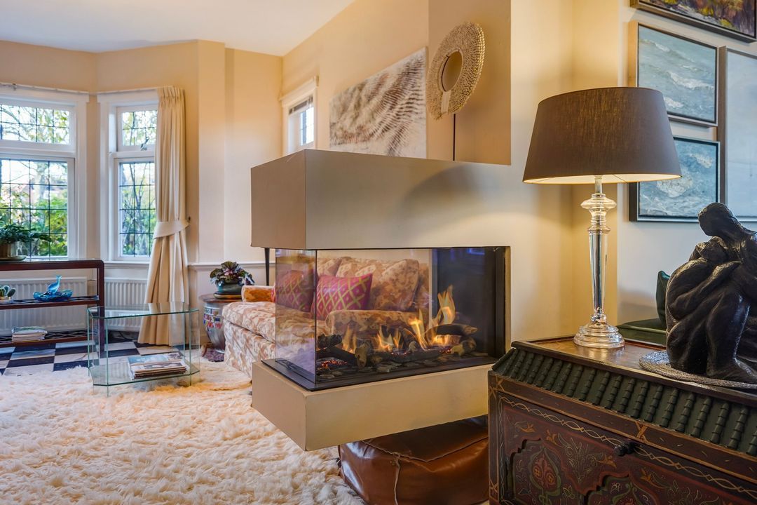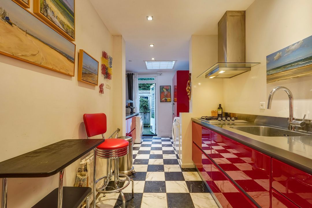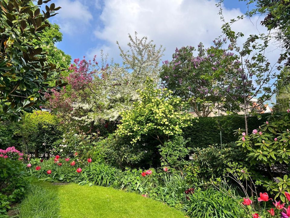 Entrance with awning, vestibule with a draft divider featuring stained glass and black and white marble floor tiles throughout the ground floor, recessed underneath stair cupboard, toilet with original wall tiles and a hand basin, attractive and extended living/dining room with side and rear extensions, front bay window, gas fireplace and lots of natural light through the many windows, extended red kitchen with stainless steel countertops and various built-in appliances such as a 4-burner gas stove, combination microwave, refrigerator/freezer (3 drawers) and washing machine connection. Beautifully landscaped garden with a wooden and stone shed and several patios.
