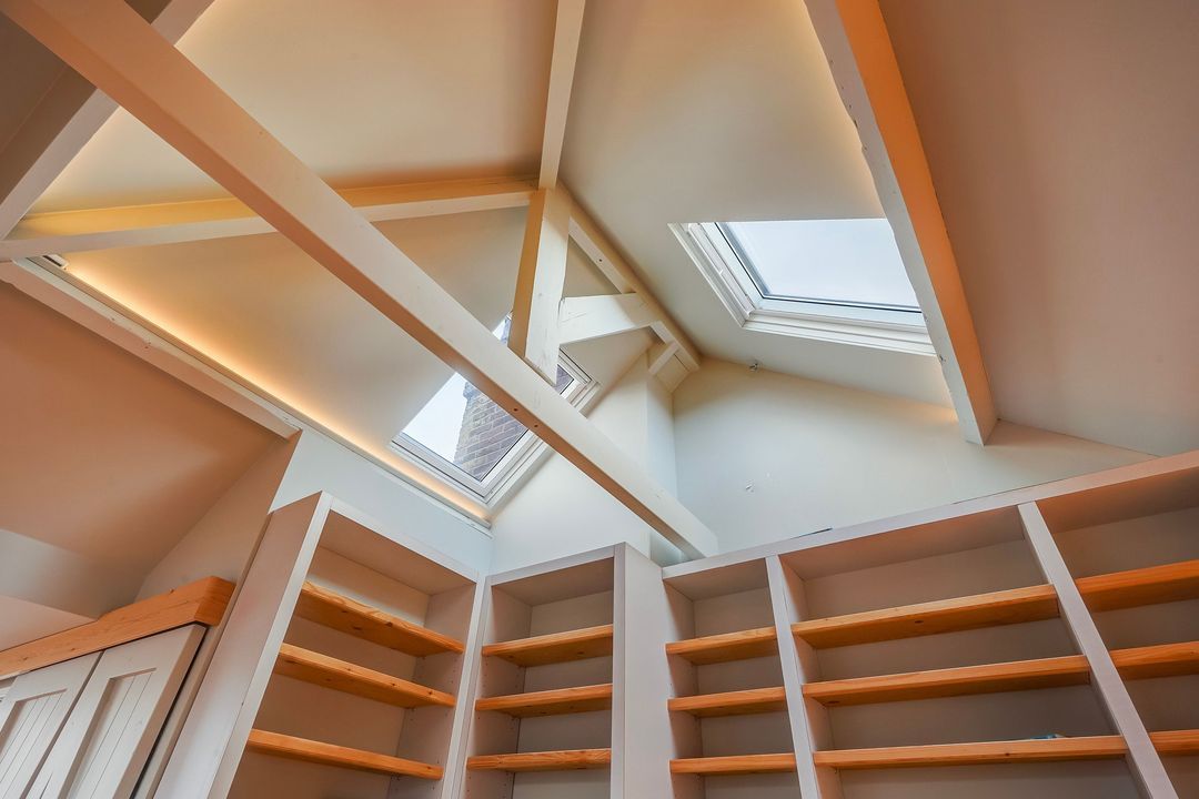 One large, beautiful attic room with a dormer window in each roof slope, two skylights, a built-in cupboard and a second modern bathroom with a vanity unit, toilet and walk-in shower