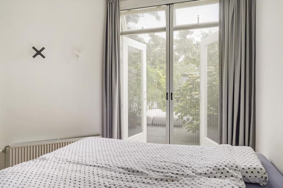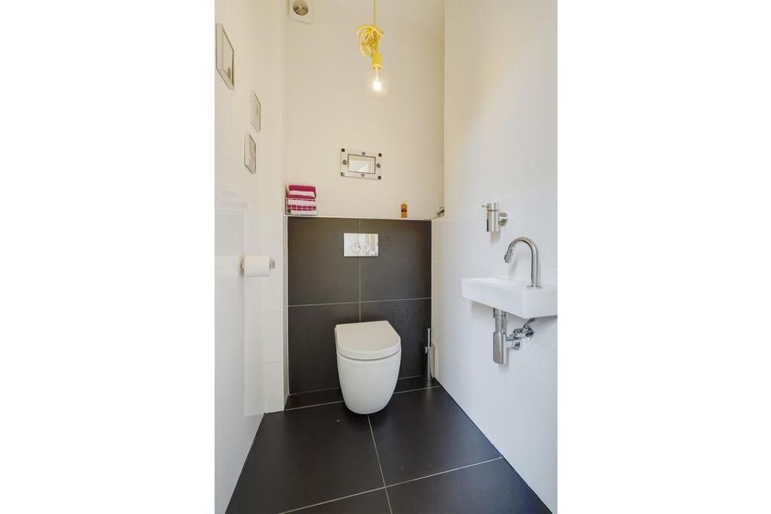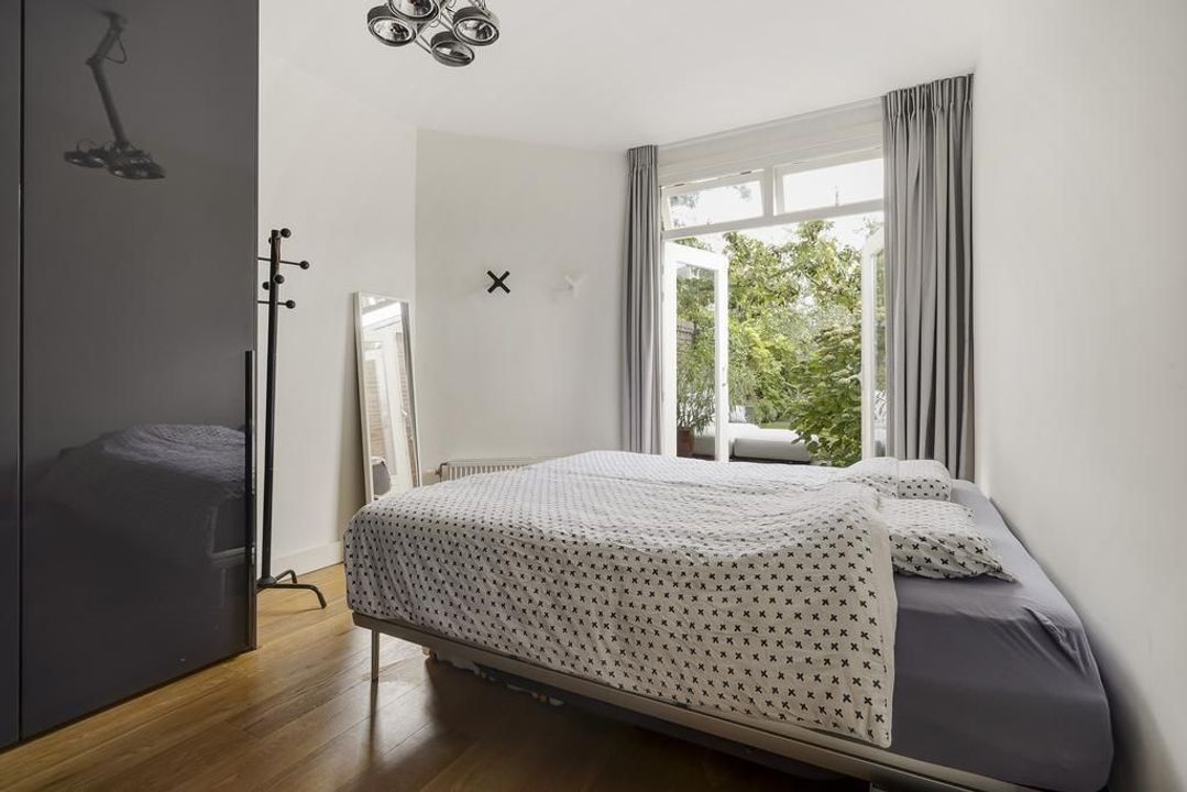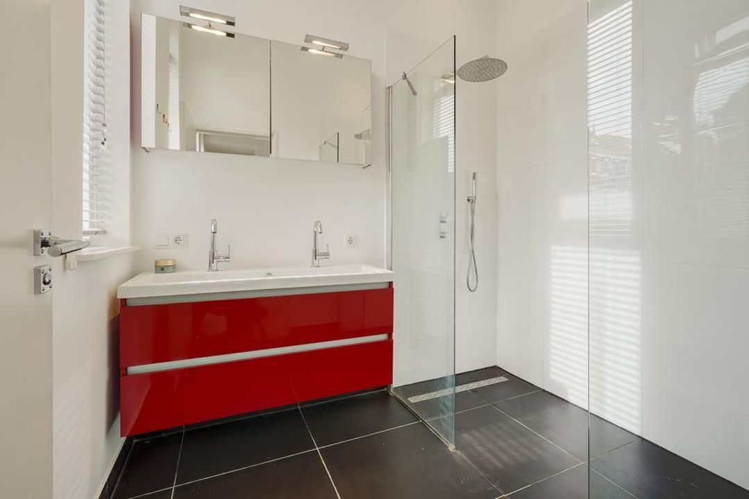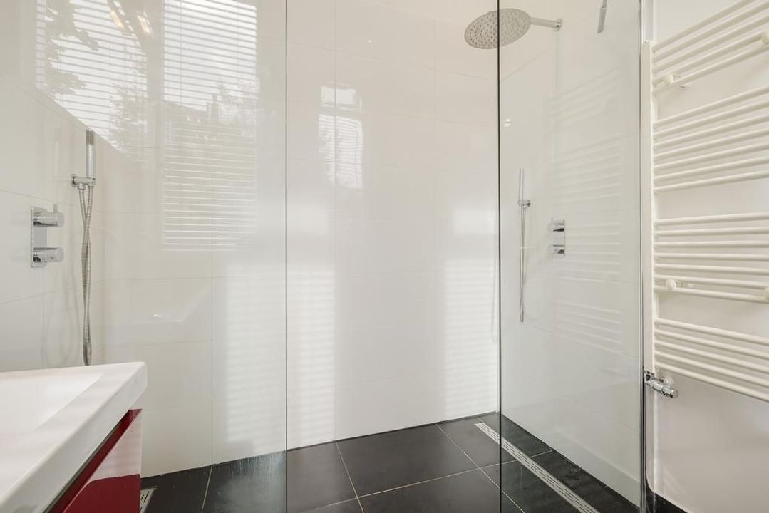 Modern, zwart wit betegelde badkamer voorzien van dubbele inloopdouche, dubbel wastafelmeubel, spiegelkasten, 2 zijramen en designradiator, separaat modern toilet met fontein. 3 Slaapkamers in de achterbouw, waarvan de achterslaapkamer via de openslaande deuren toegang biedt tot de sfeervolle stadstuin.