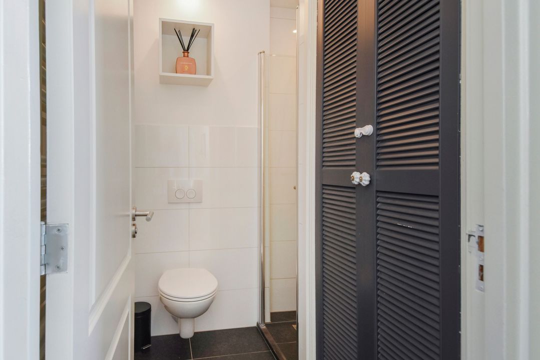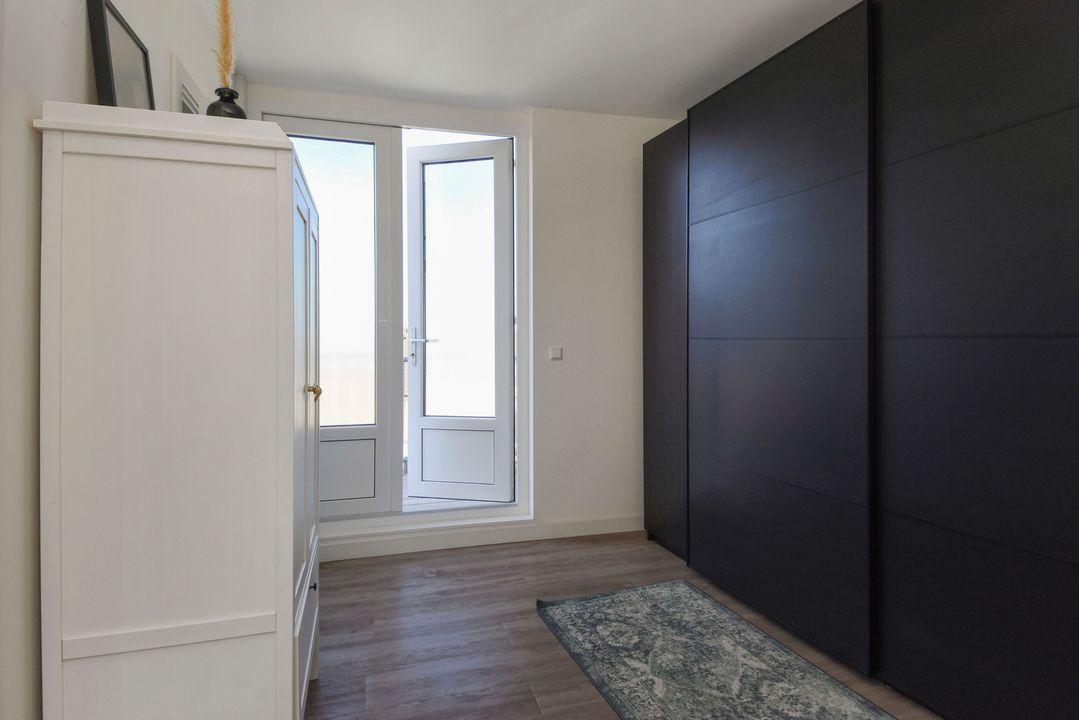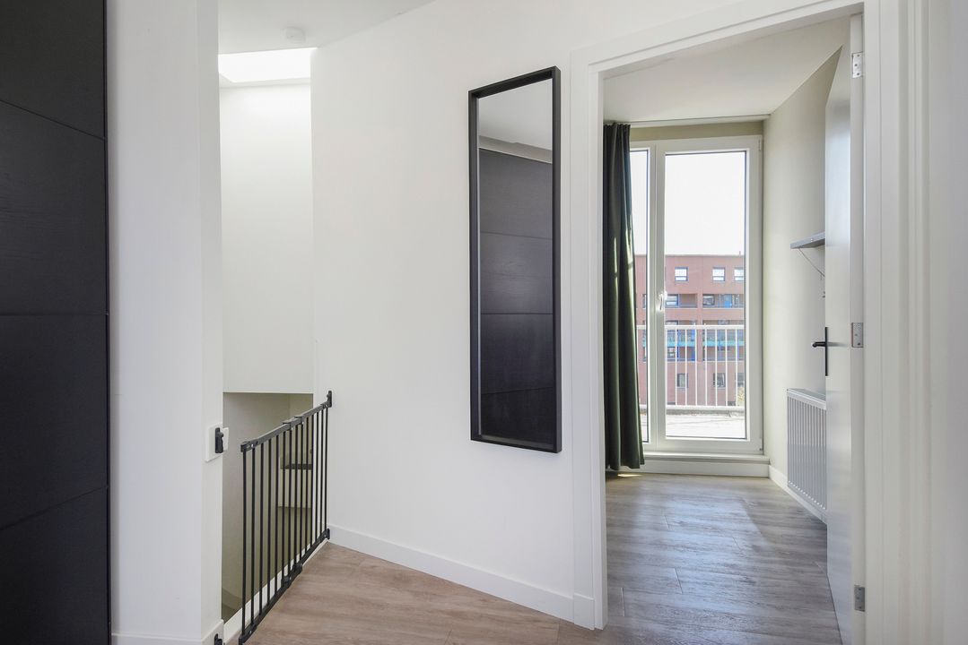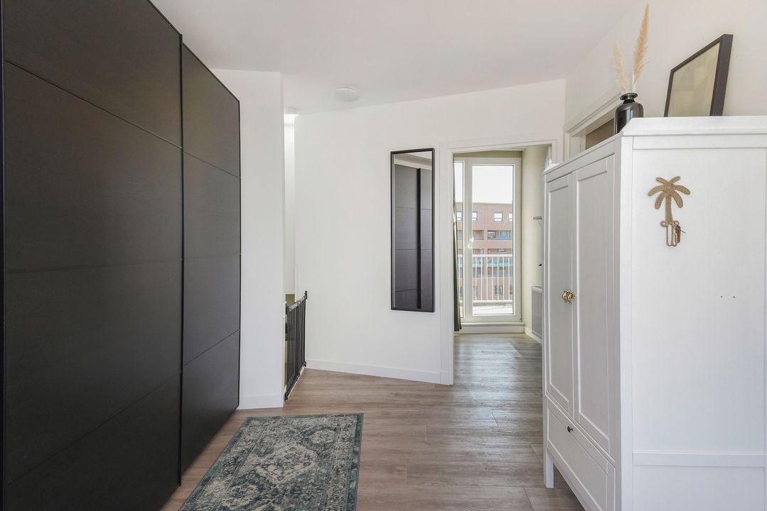 Spacious landing, second modern and spacious bathroom with a shower, vanity, and toilet. Two bedrooms are located at the front, one of which has French doors opening onto the south-facing terrace with durable hardwood decking and stunning views of Scheveningen harbor.