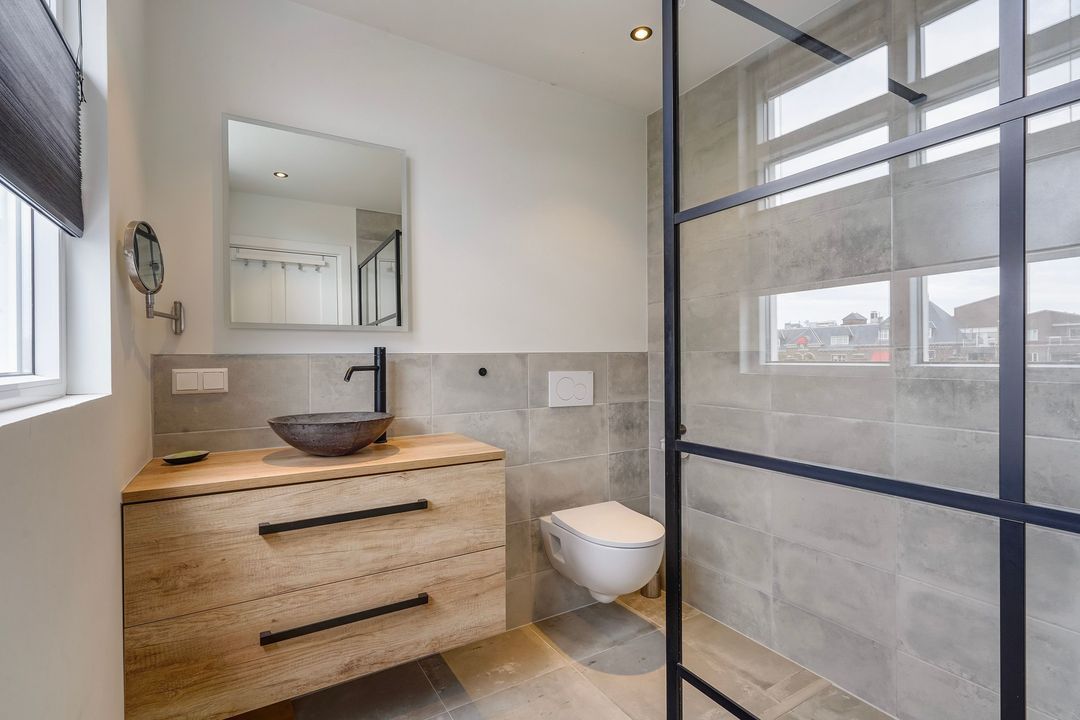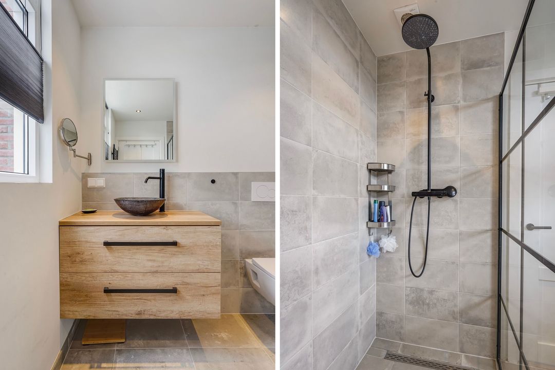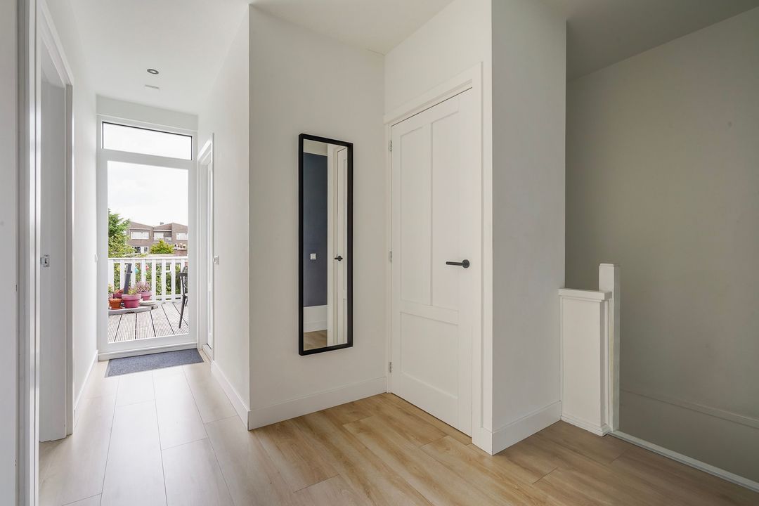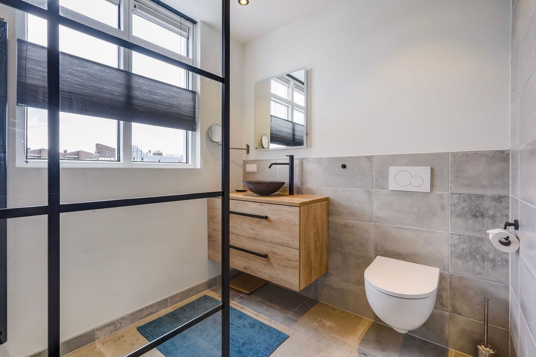 Another spacious landing with a built-in closet housing the central heating boiler, a rear bedroom, and a modern bathroom with a walk-in shower, vanity unit, and toilet. A spacious front bedroom with a balcony offer unobstructed views of Vlierboomstraat. Second front bedroom.