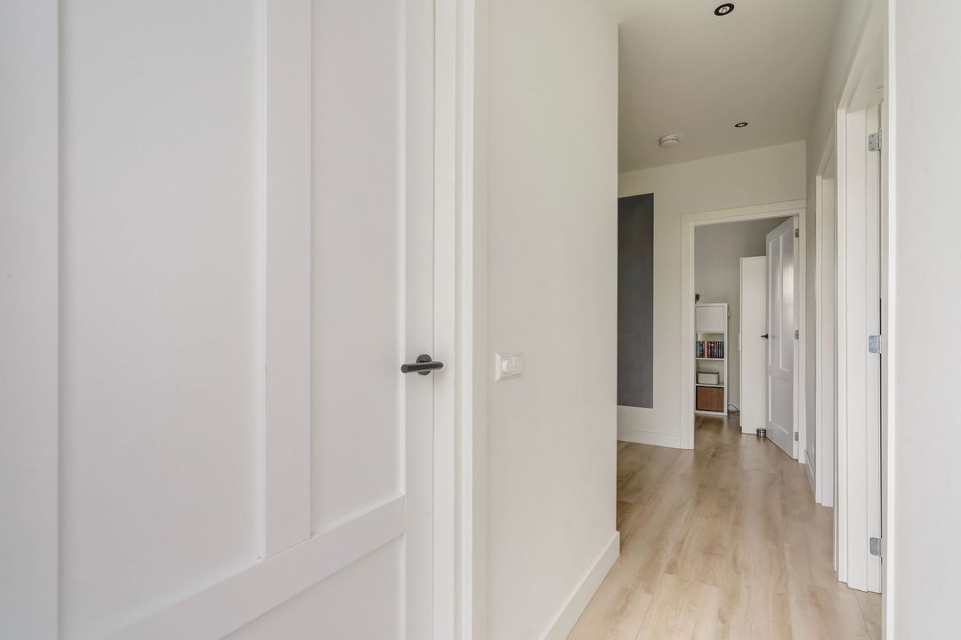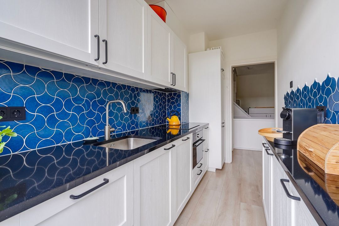 Ruime hal in U-vorm, vaste kast met wasmachine- en drogeraansluiting en onder de trap naar de 3e verdieping extra bergruimte, modern toilet, nette keuken voorzien van fraai tegelwerk en inbouwapparatuur (2025), zoals inductie met geïntegreerde afzuiging, oven met magnetronfunctie, vaatwasser en koel-/vrieskast.