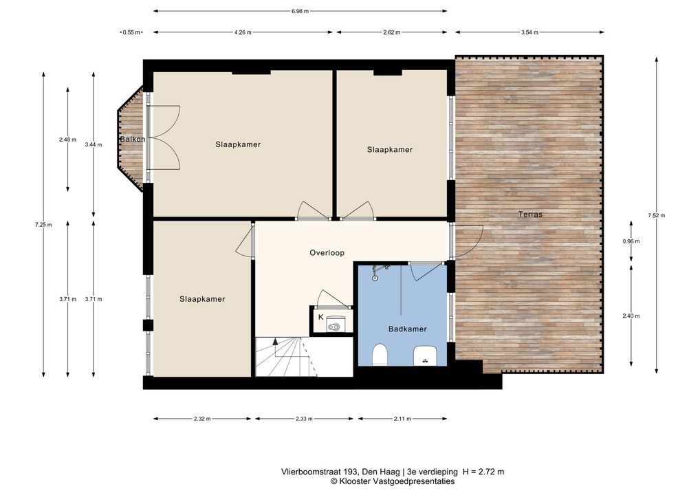Wederom een ruime overloop met vaste kast met opstelplaats c.v.-combiketel, achterslaapkamer, moderne badkamer met inloop (stort) douche, badkamermeubel en toilet. Ruime voorslaapkamer annex balkon met vrij uitzicht door de Vlierboomstraat. Tweede voorslaapkamer.