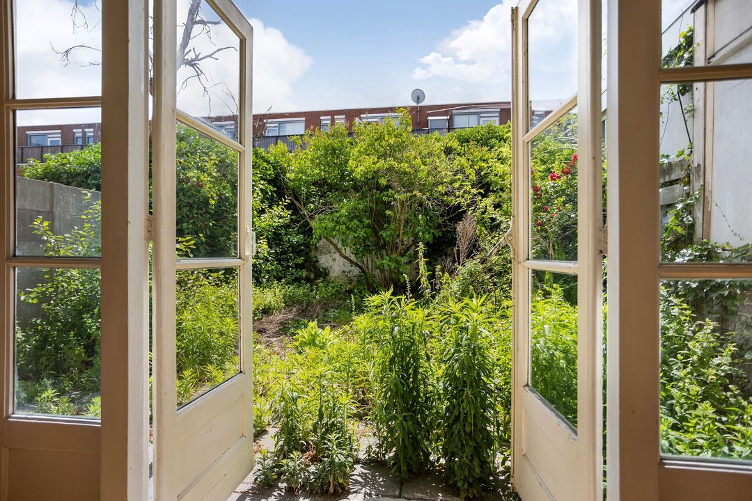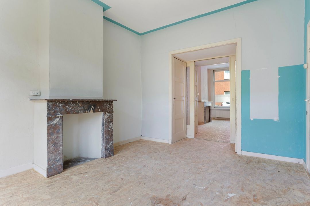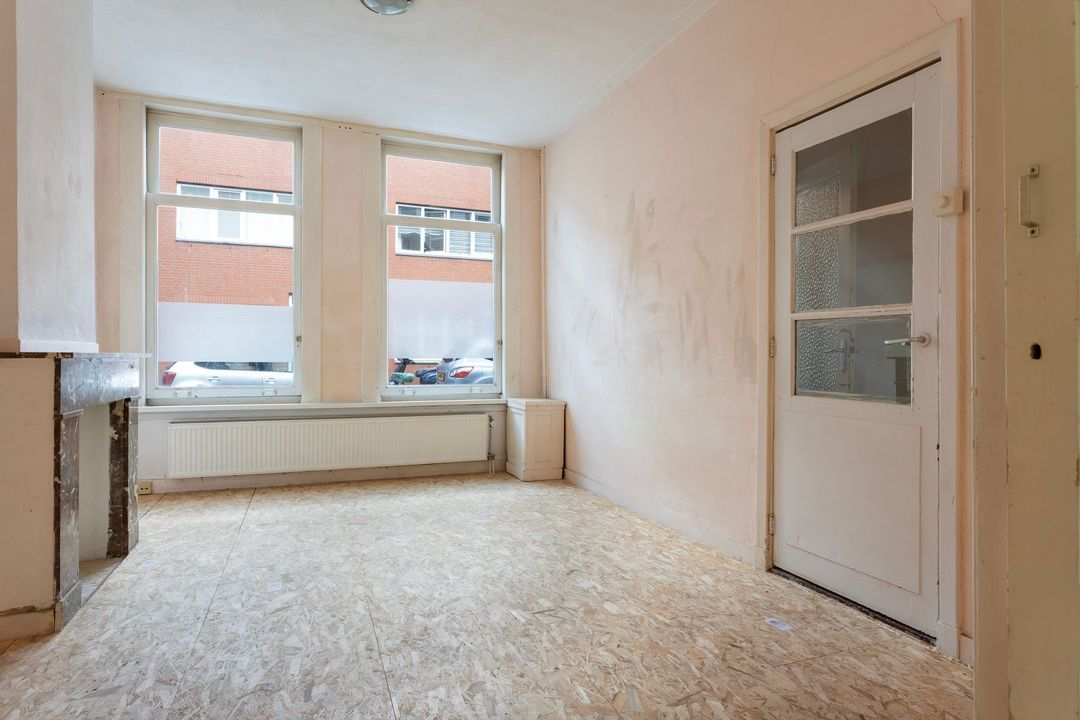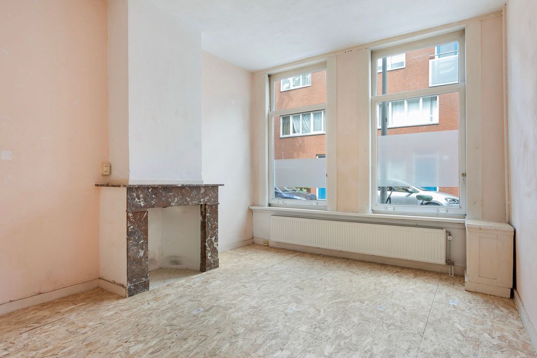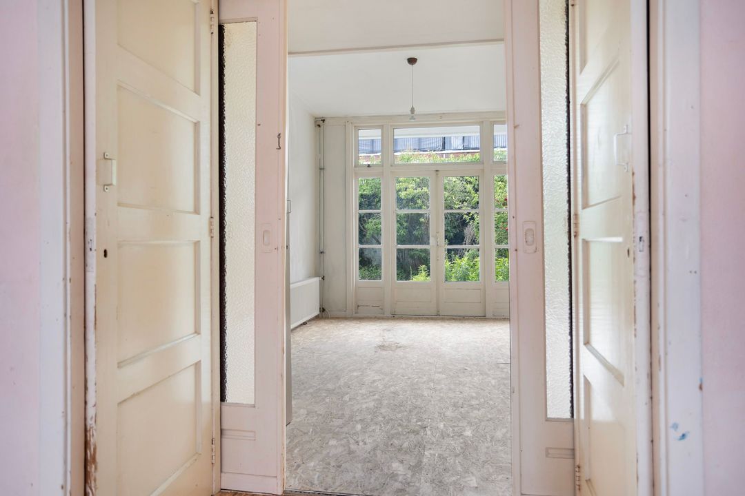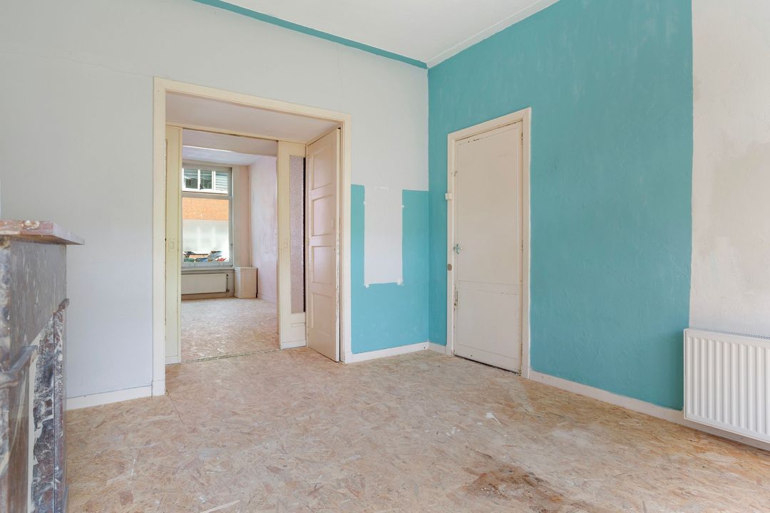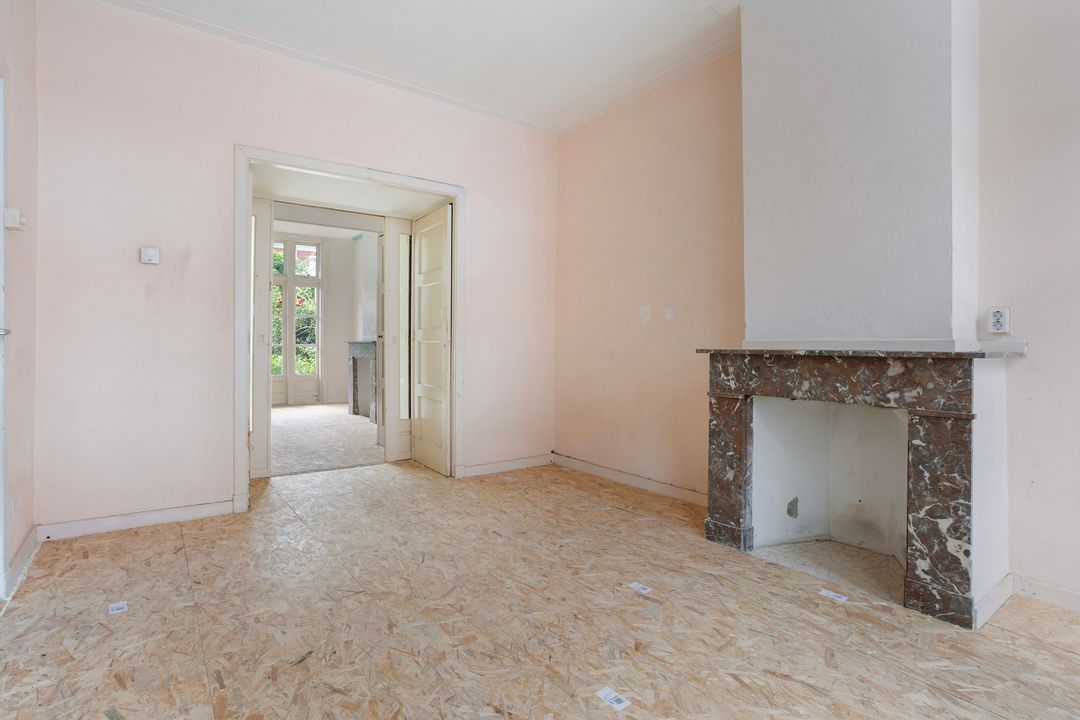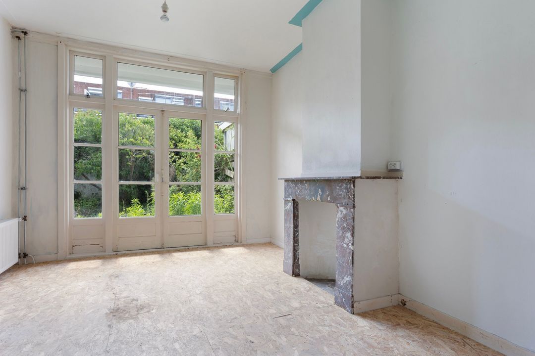 Kamer en suite (voor- en achterkamer) voorzien van een schuifseparatie, 4 vaste kasten, 2 marmeren schouwen en dubbele deuren naar de ruime zonnige achtertuin op het zuidoosten. Voor- of achterkamer in te delen als slaapkamer.