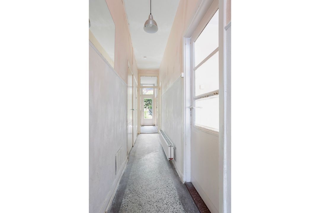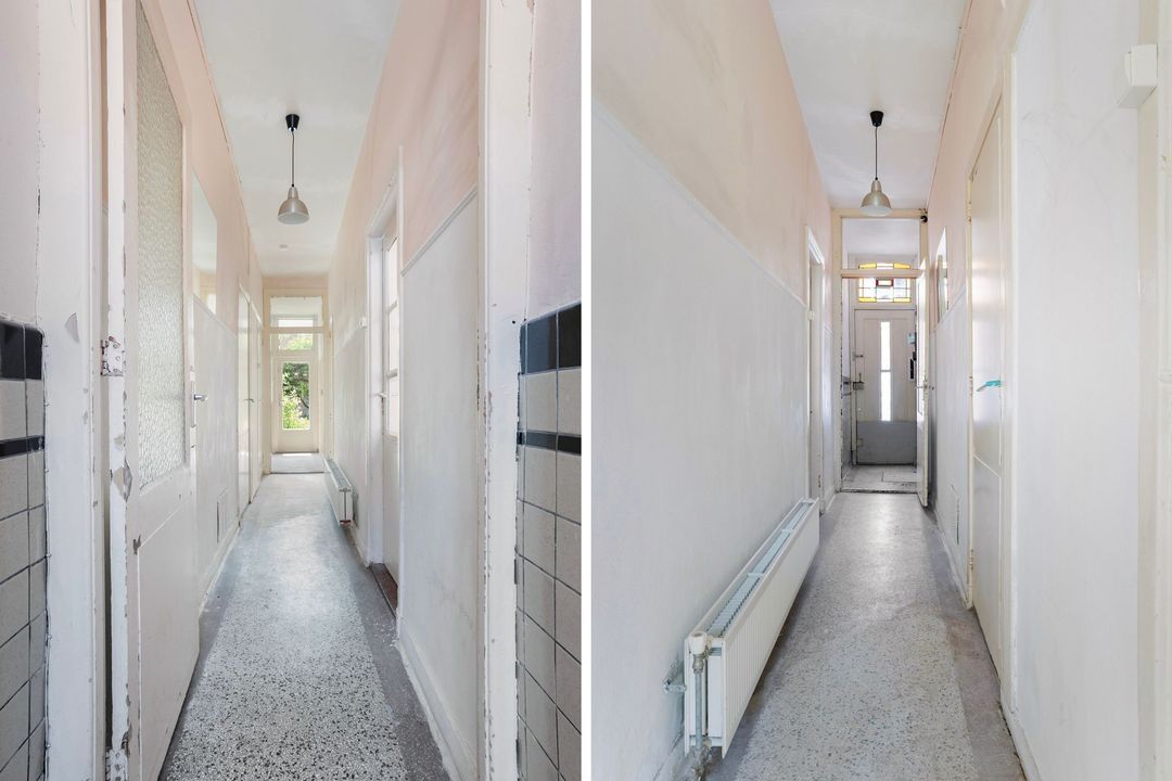 Entree, tochtdeur, gang met granitovloer doorgelegd naar de keuken aan de achterzijde, trappenkast met aansluiting wasmachine, badkamer voorzien van douche, wastafeltje en toilet.