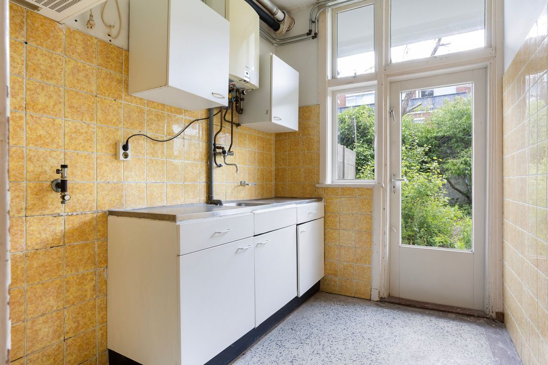 Keuken voorzien van een keukenblok, opstelplaats cv en deur naar de fraaie achtertuin.