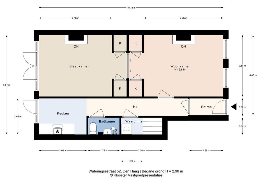 Entrance, draught door, hallway with granite floor leading to the kitchen at the rear, staircase cupboard with washing machine connection, bathroom with shower, washbasin and toilet.
