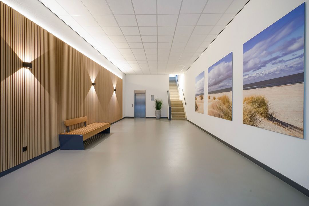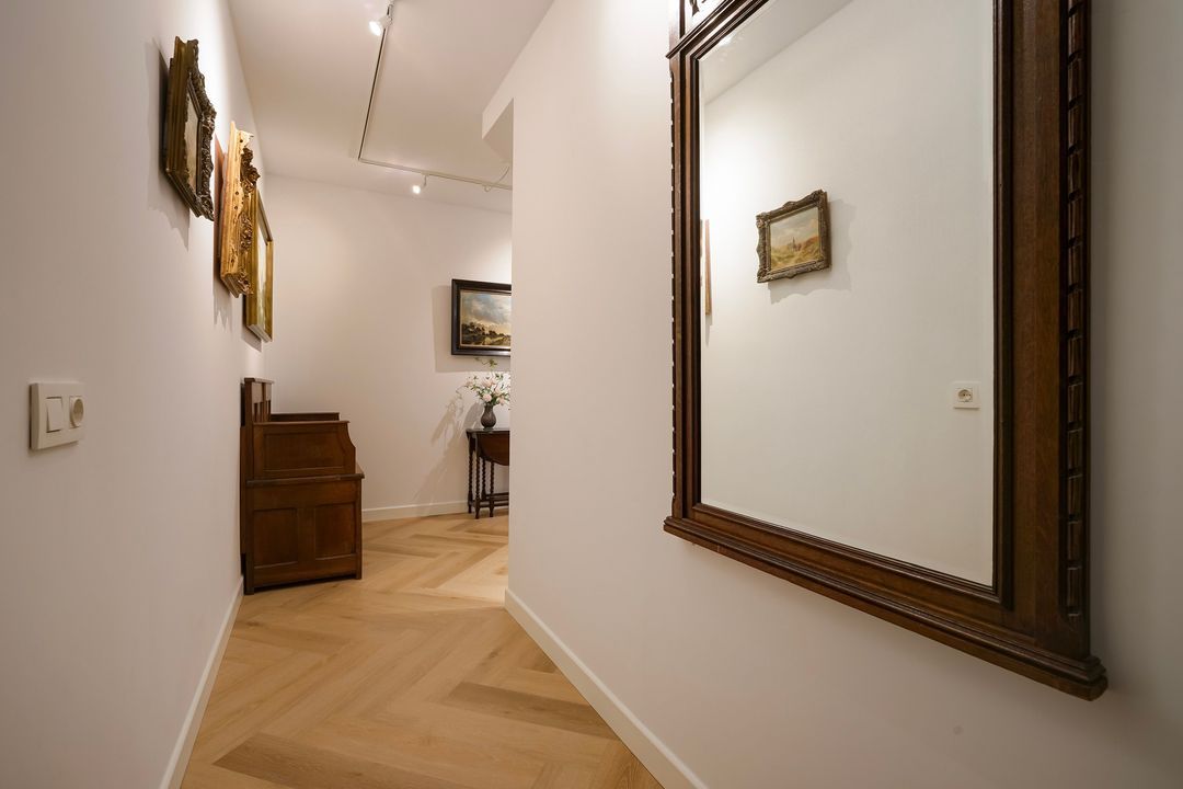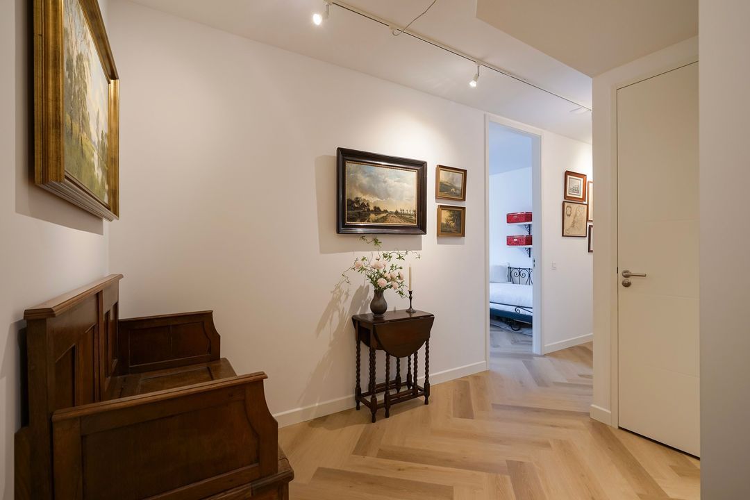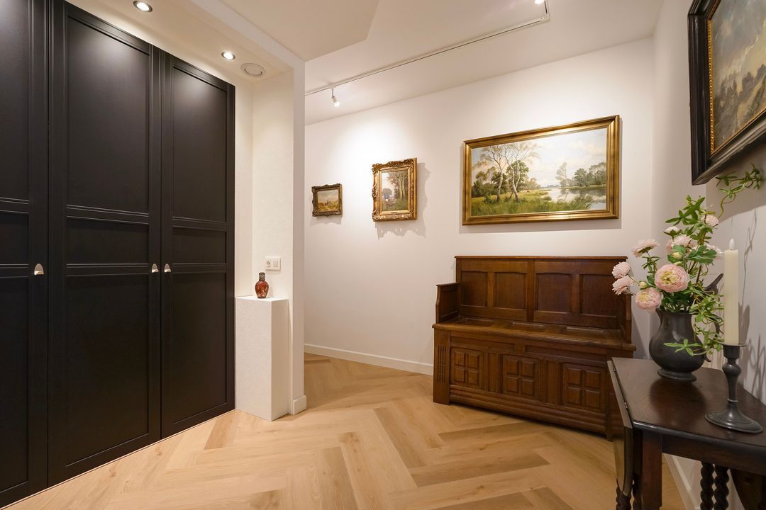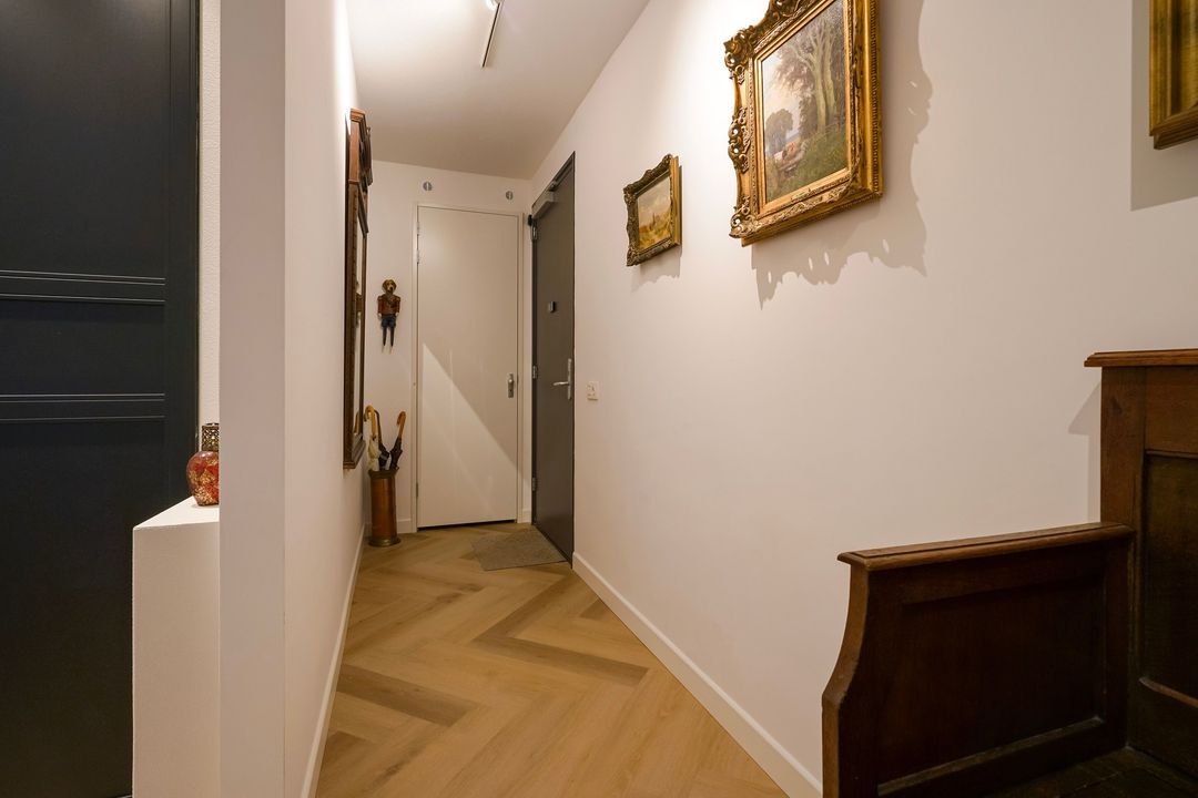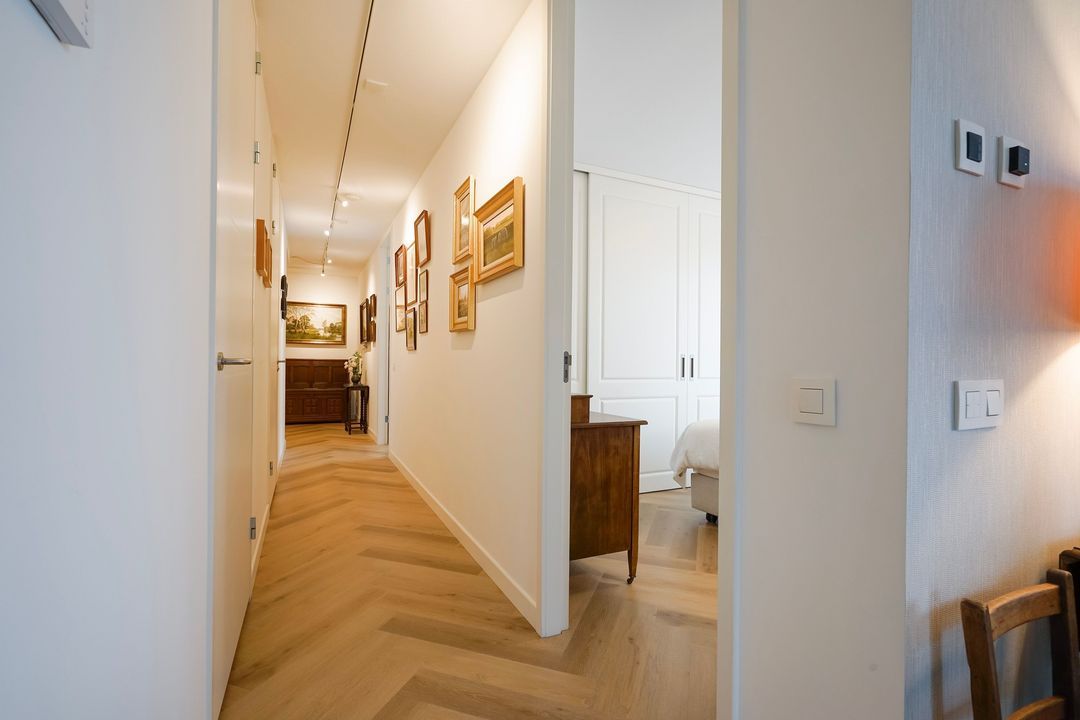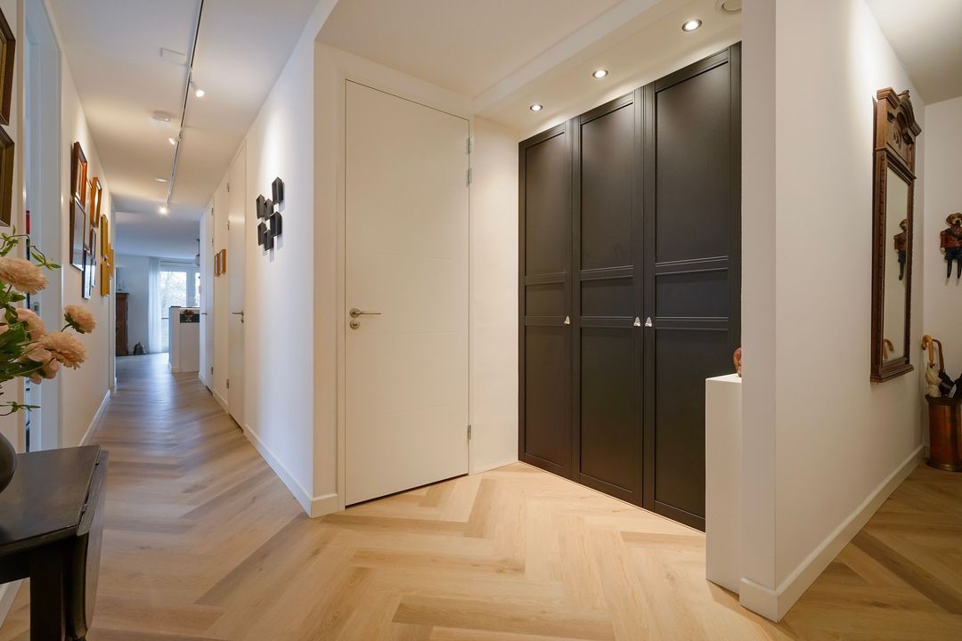 Entree appartement, ruime L-vormige overloop voorzien van fraaie pvc-vloer in visgraatmotief met vloerverwarming geheel doorgelegd in het appartement, meterkast en garderobekast met opstelplaats cv-ketel.