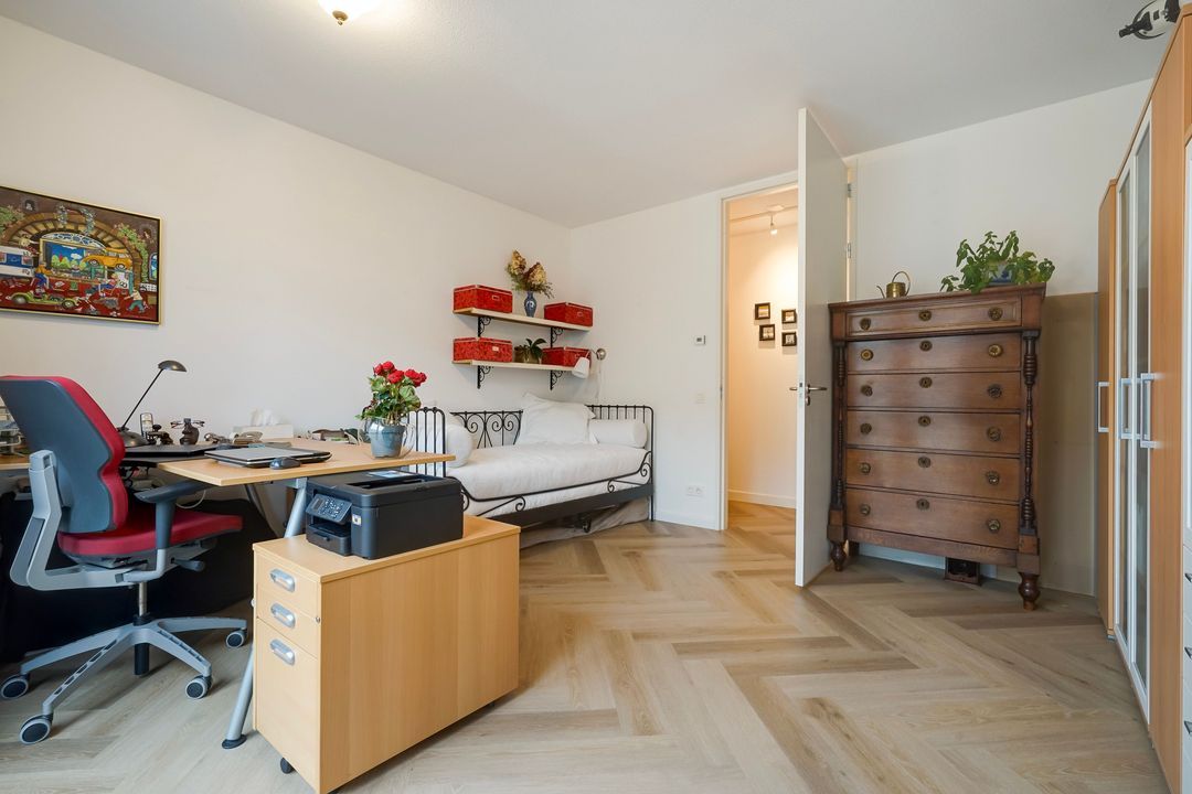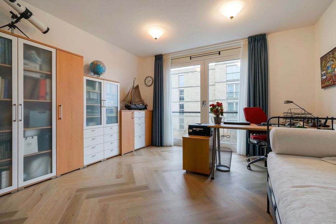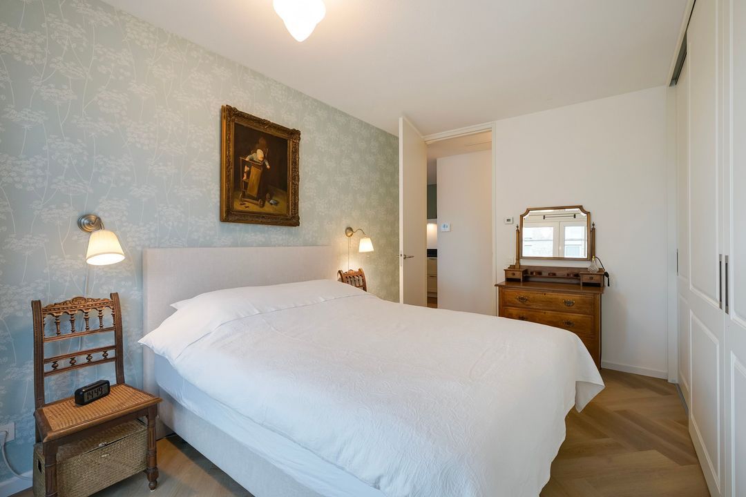 Eerste lichte slaapkamer met op maat gemaakte kastenwand en tevens deuren naar terras. Tweede ruime slaapkamer met openslaande deuren naar Frans balkon.