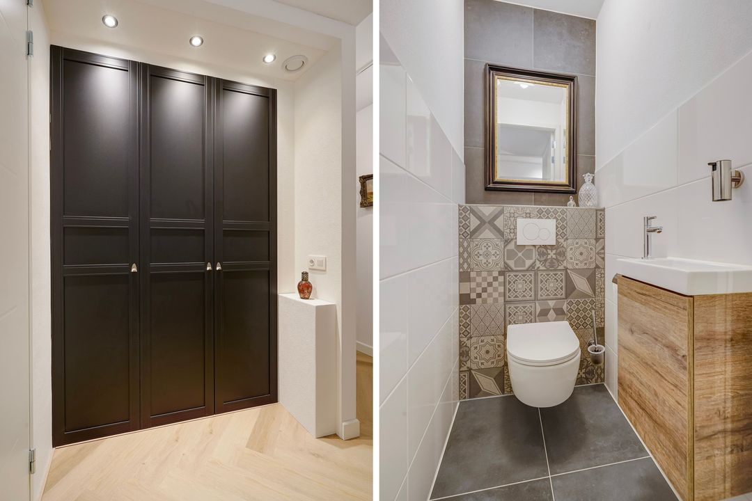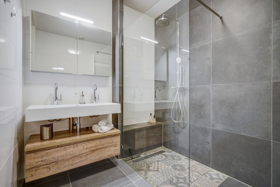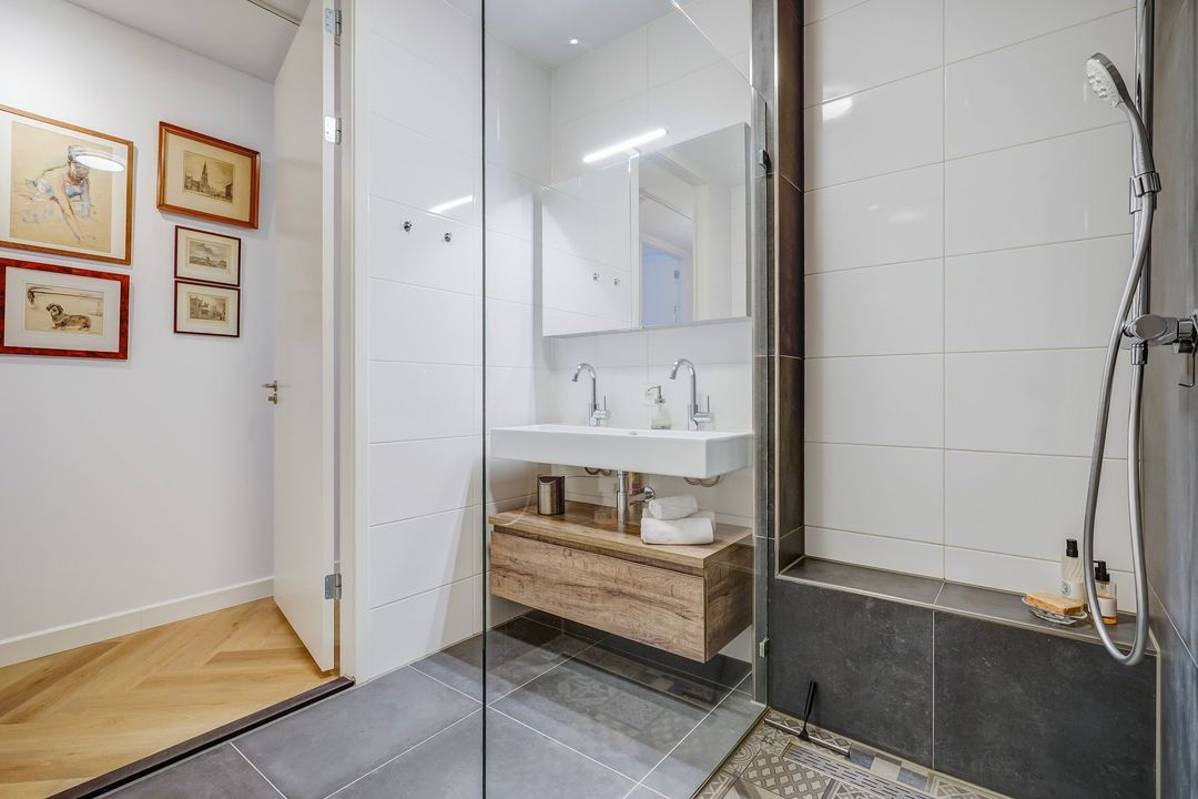 Separaat ruim toilet met fonteinmeubel, fraai geheel betegelde badkamer voorzien van ruime inloopdouche, dubbele wastafel met meubel en spiegelkast, designradiator en vloerverwarming.