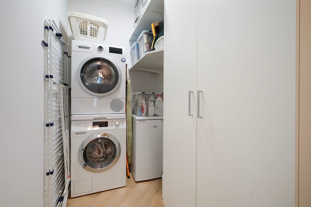 Inpandige berging met aansluitingen voor wasmachine en droger.